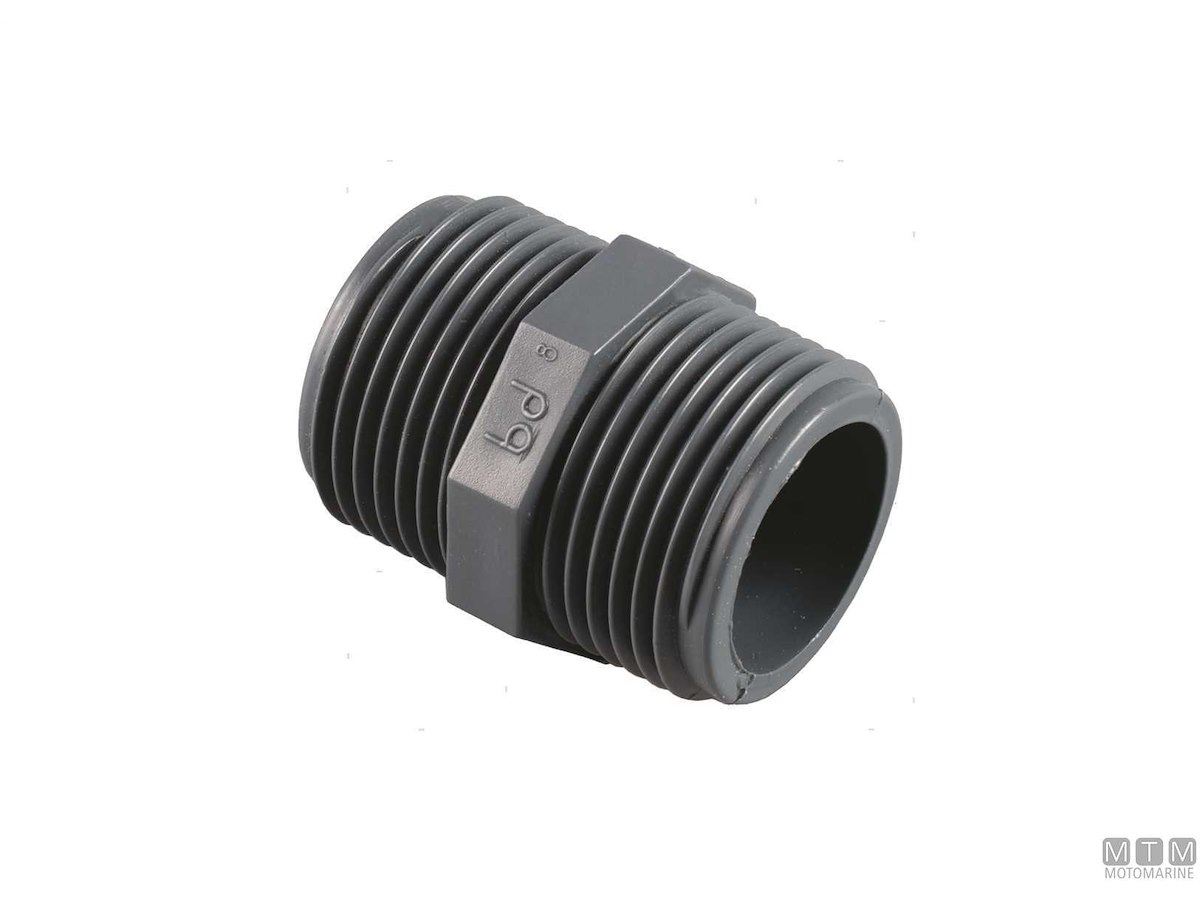 Nipple in Polipropilene composito caricato con fibre di vetro. Tenuta superiore del filetto e della pressione, resistente all'abrasione, all'usura, esente da corrosione chimica e galvanica. Idoneo per passaggio acqua dolce a norma CE 10/2011 e DM174/2004. Pressione di esercizio 10 bar a max 100°C.