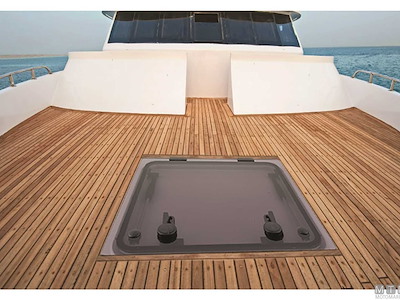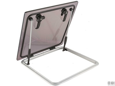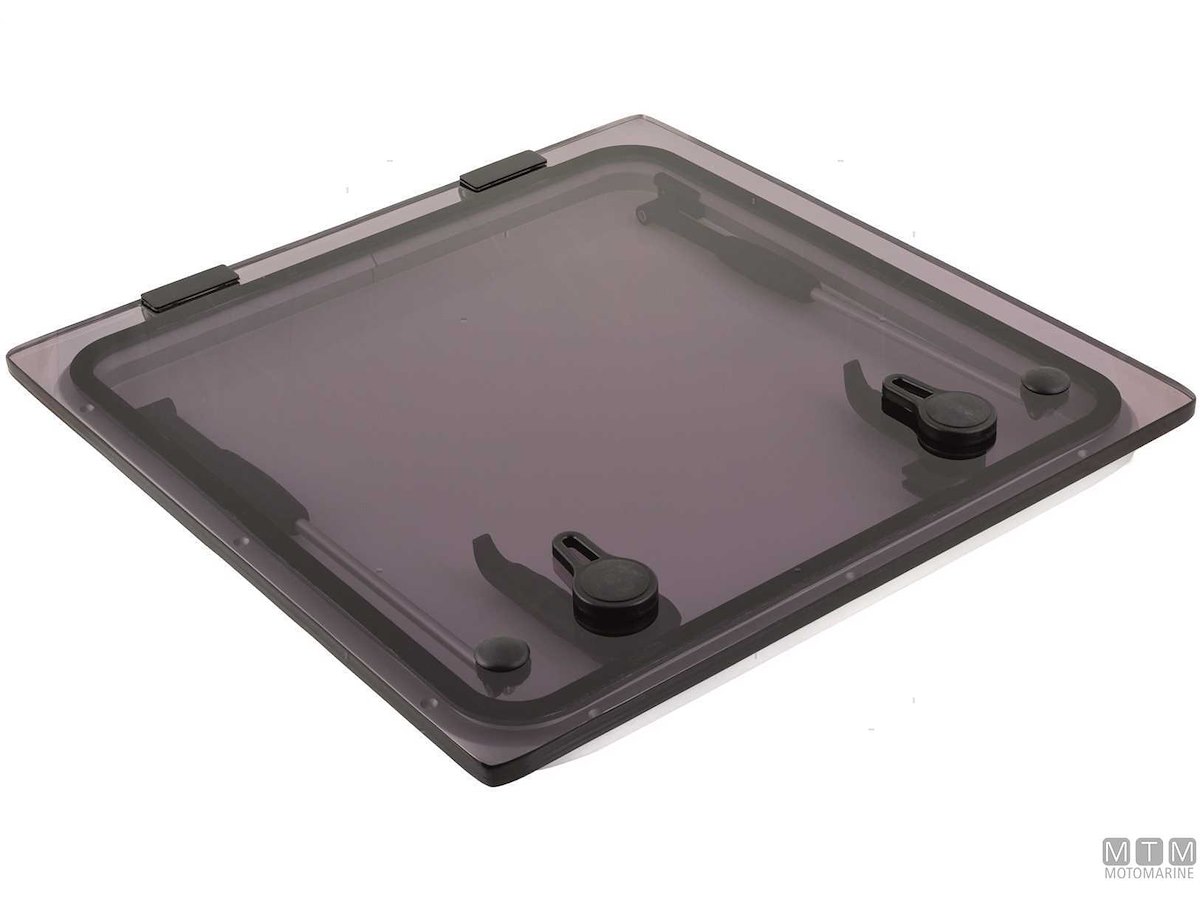 Osteriggio Goiot Type a incasso filo ponte in Allumio Anodizzato satinato. Vetro colore fumè chiaro in Metacrilato spessore 10 mm. Guarnizione e maniglie livellate per una chiusura a tenuta stagna.