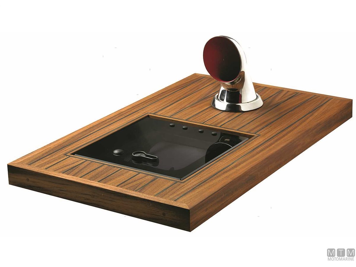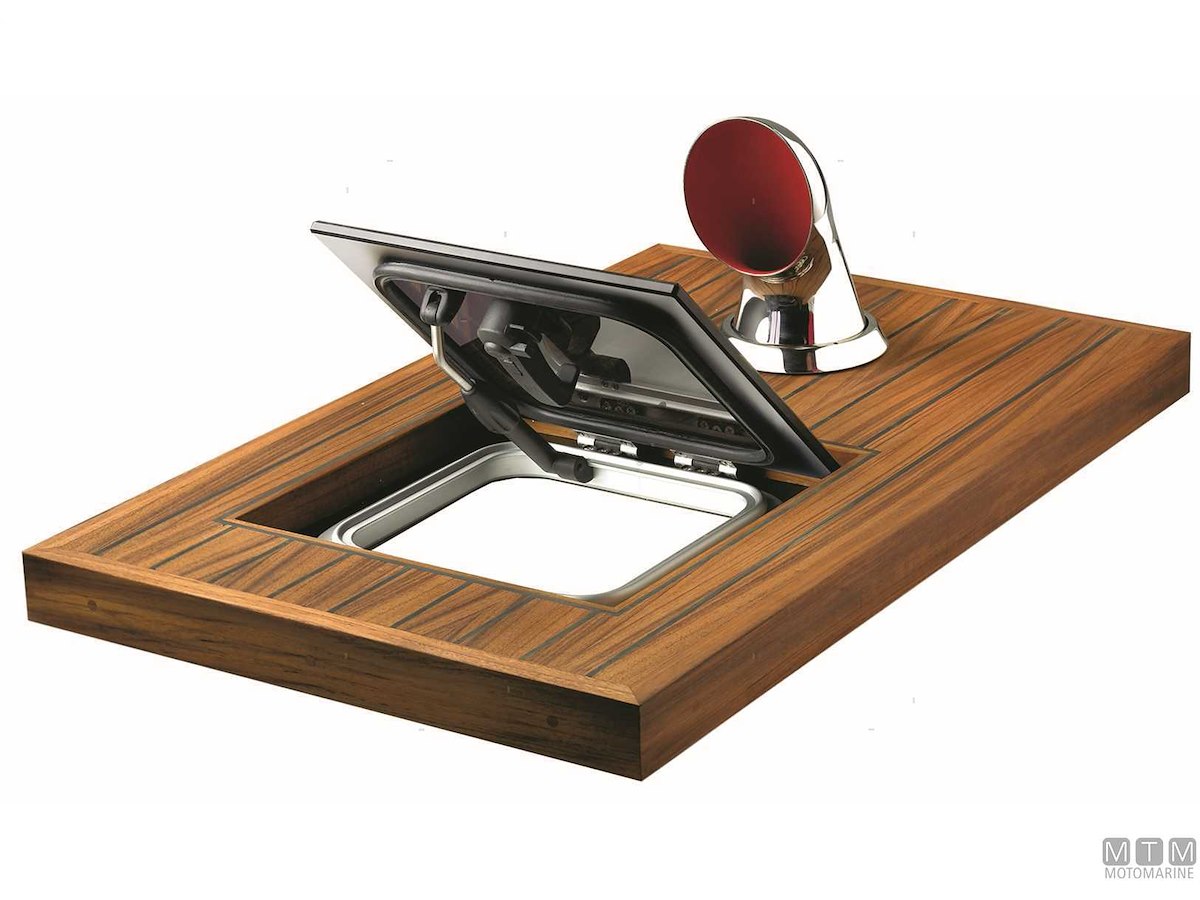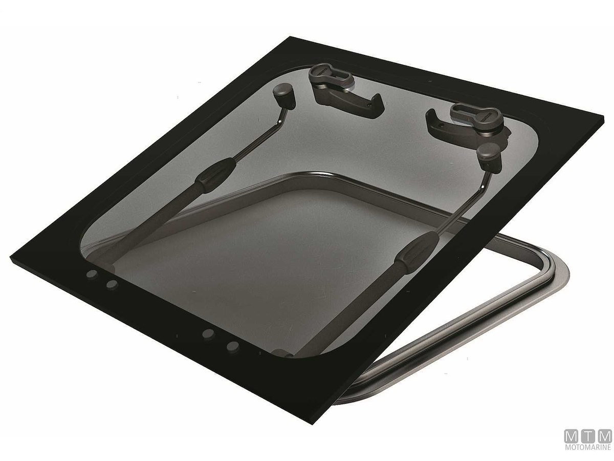 Osteriggio a filo ponte Vetus con cornice in Alluminio Anodizzato certificato CE classe AII. Completamente integrato nel ponte, non sono visibili parti sporgenti. Vetro colore fumè scuro in Acrilico di spessore 10mm.