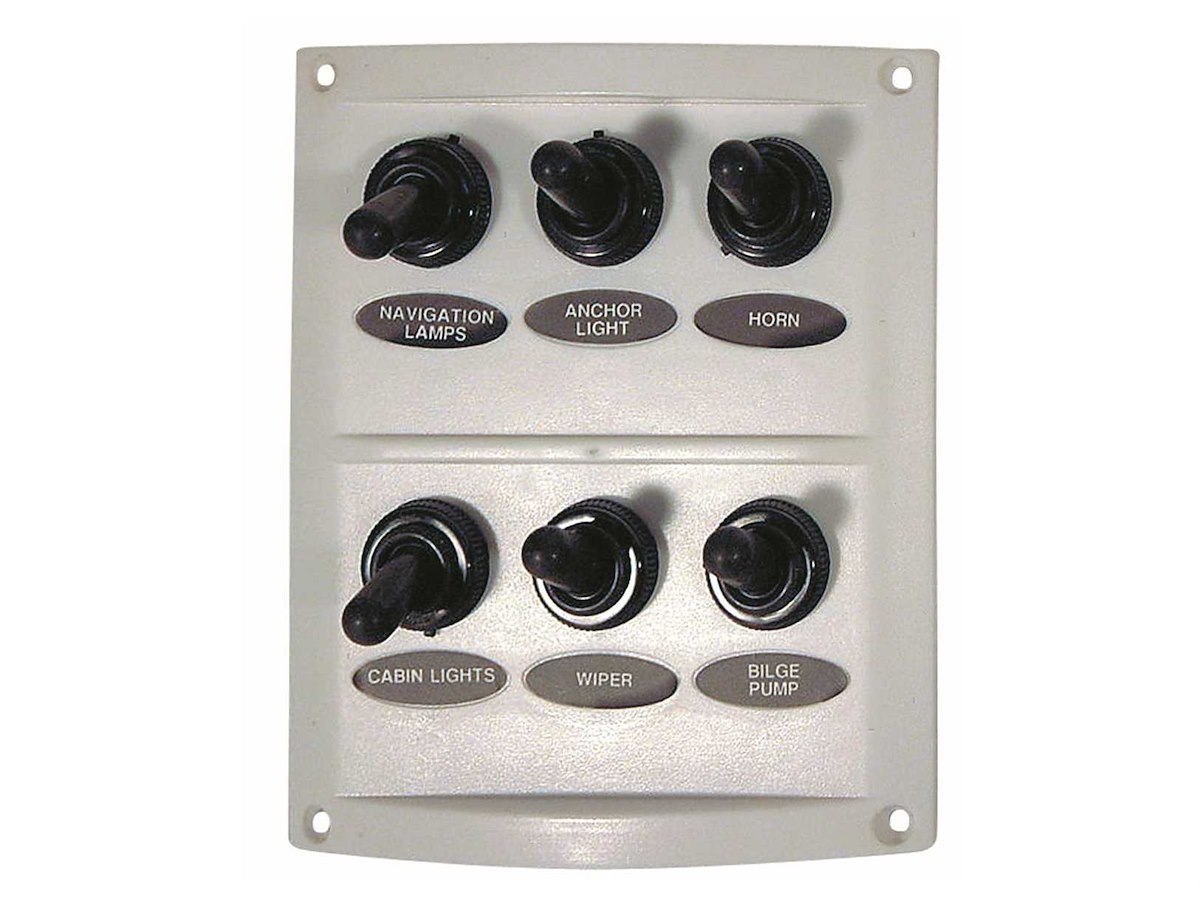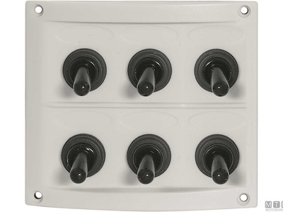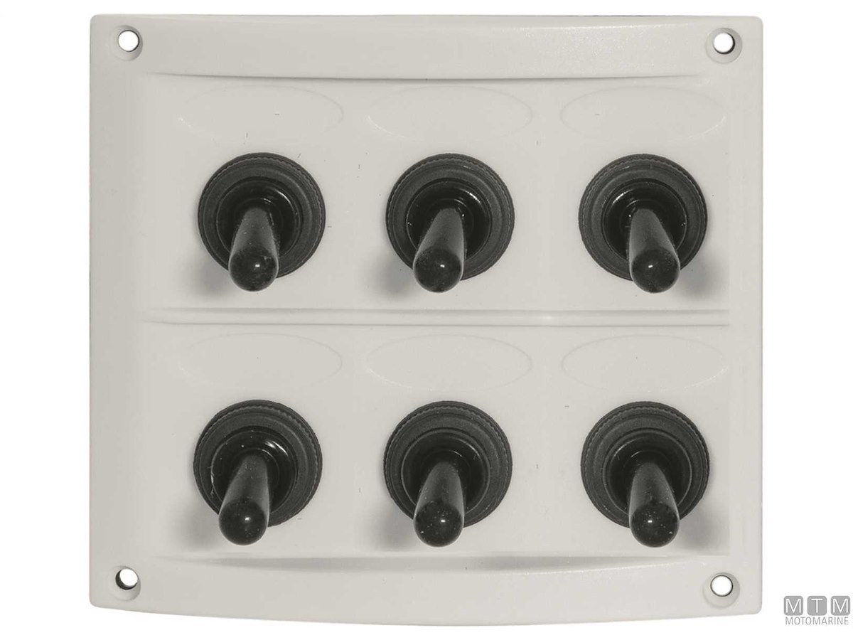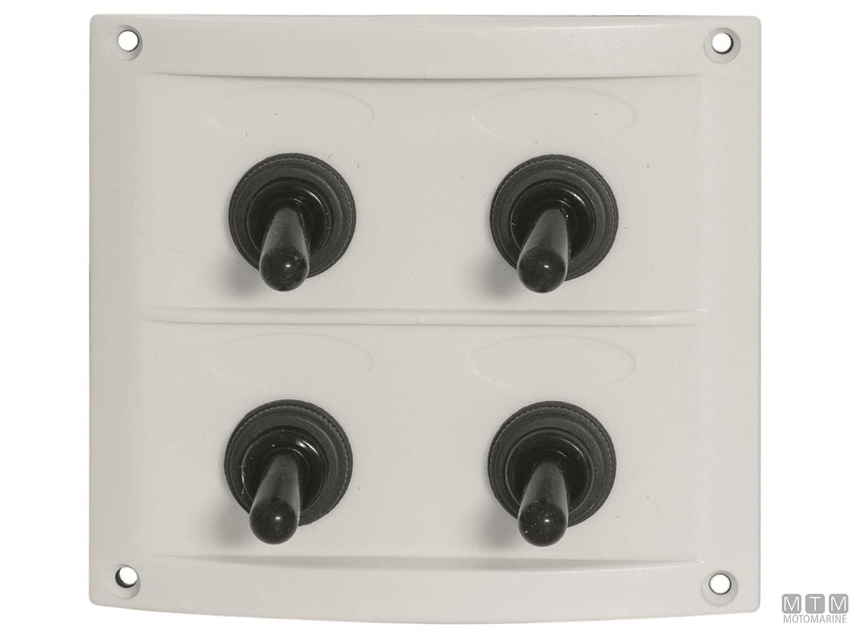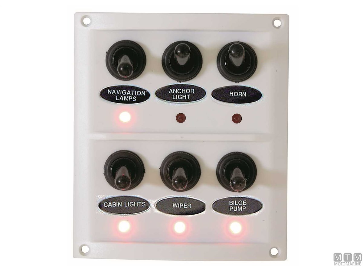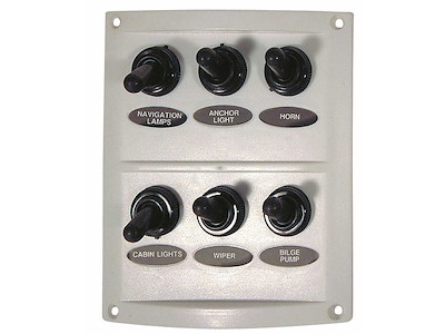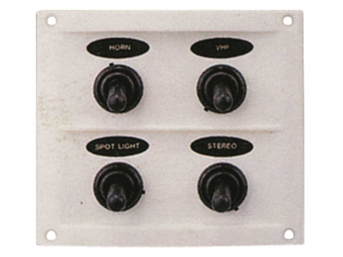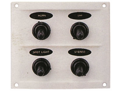 Pannello 12V in ABS con interruttori impermeabili e fusibili completo di etichette prestampate.
