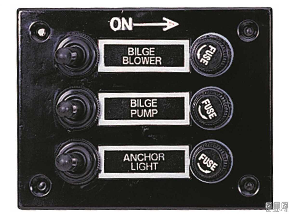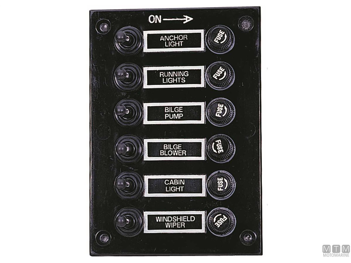 Pannello 12V in ABS con interruttori impermeabili e fusibili completo di etichette prestampate.