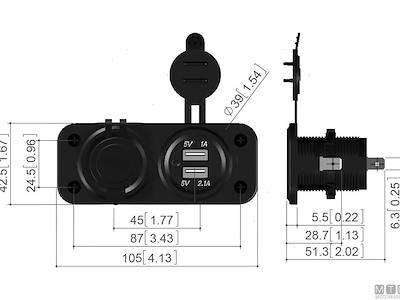 Pannello misura socket con presa 12V e presa USB doppia. Completo di cappucci di protezione.