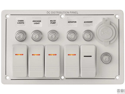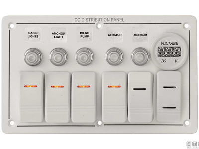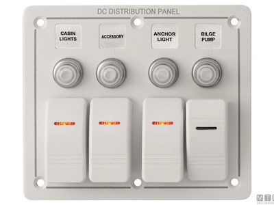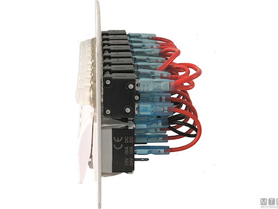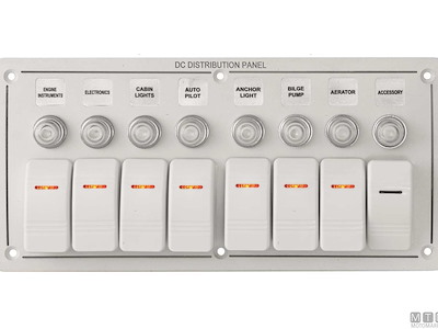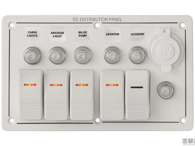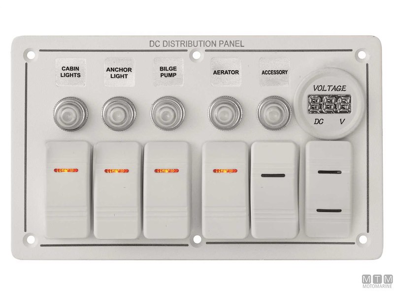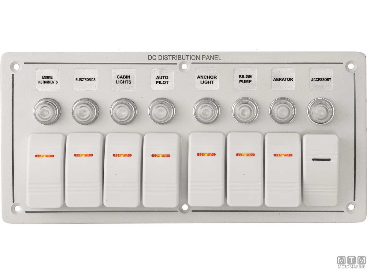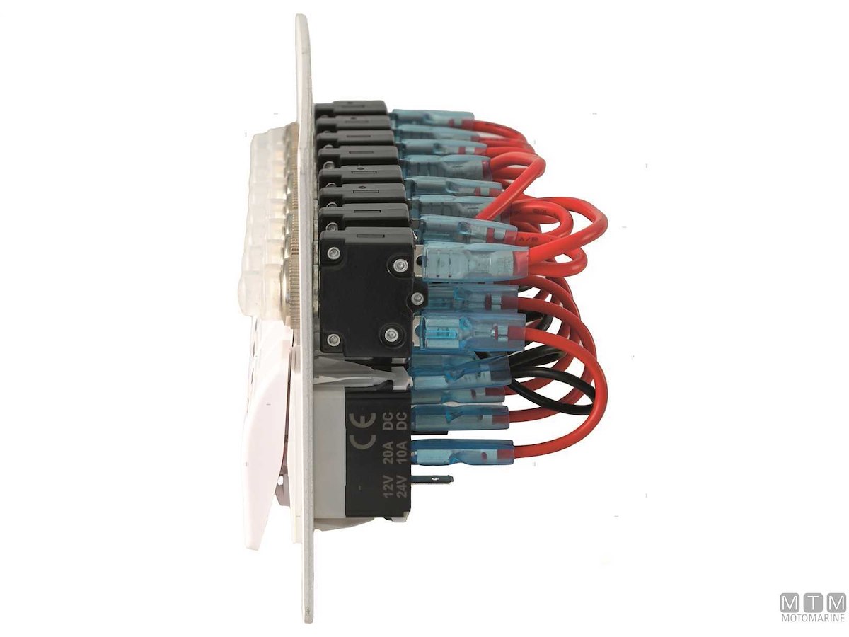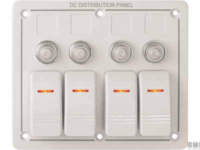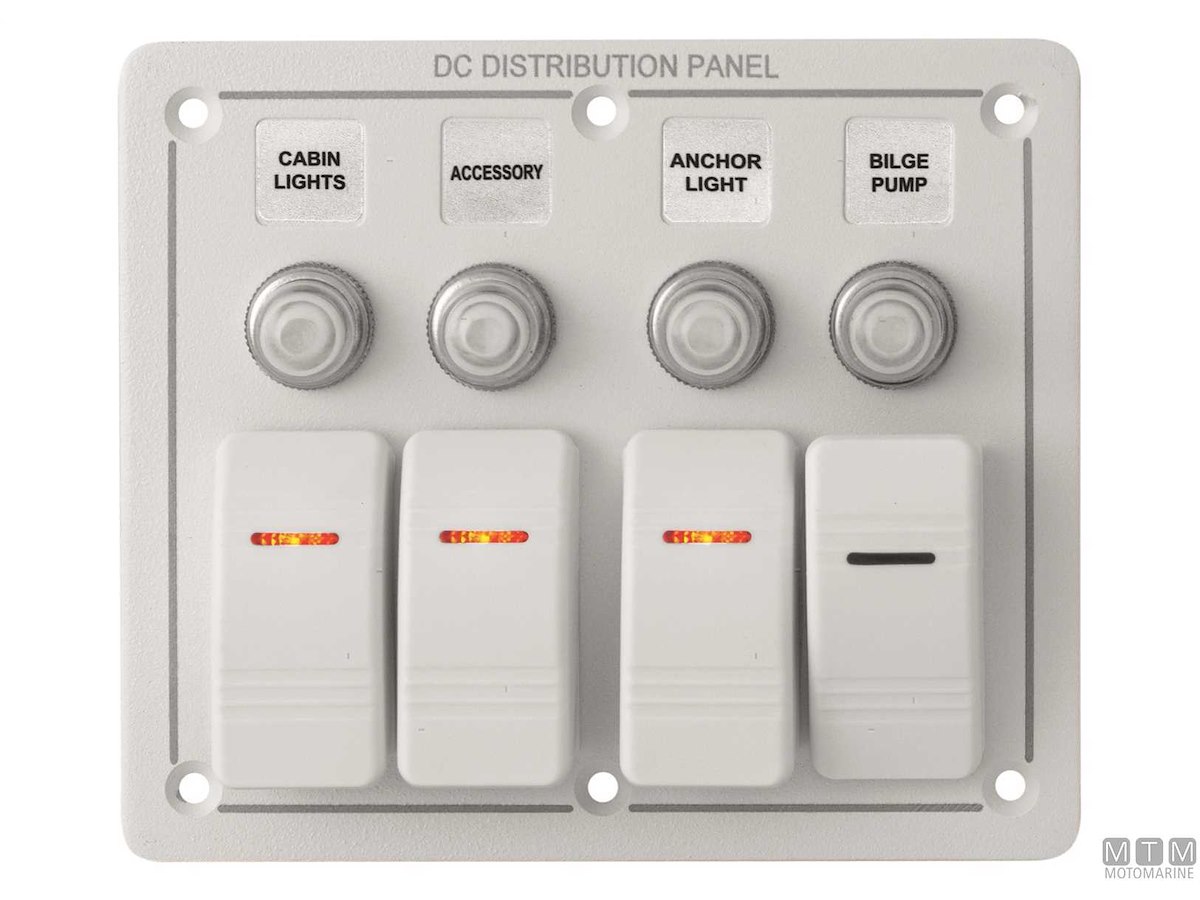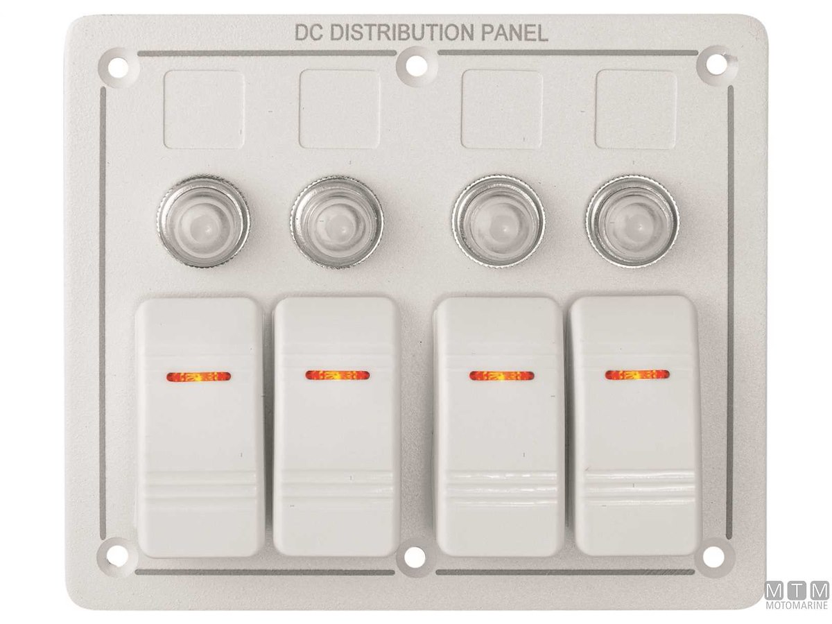 Pannello in Alluminio impermeabile IP65 con interruttori 12/24V misura Carling con luce LED e valvole automatiche reinseribili. Completo di viti montaggio e set etichette.