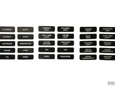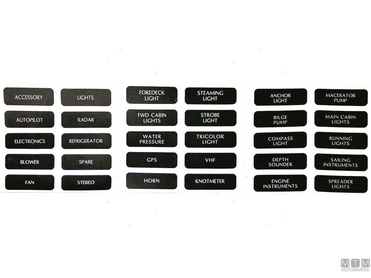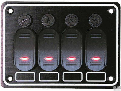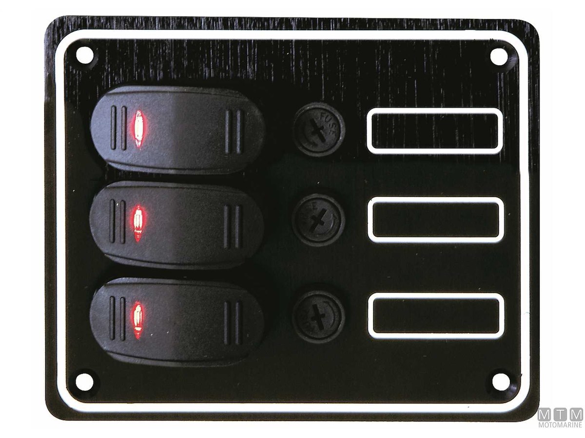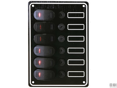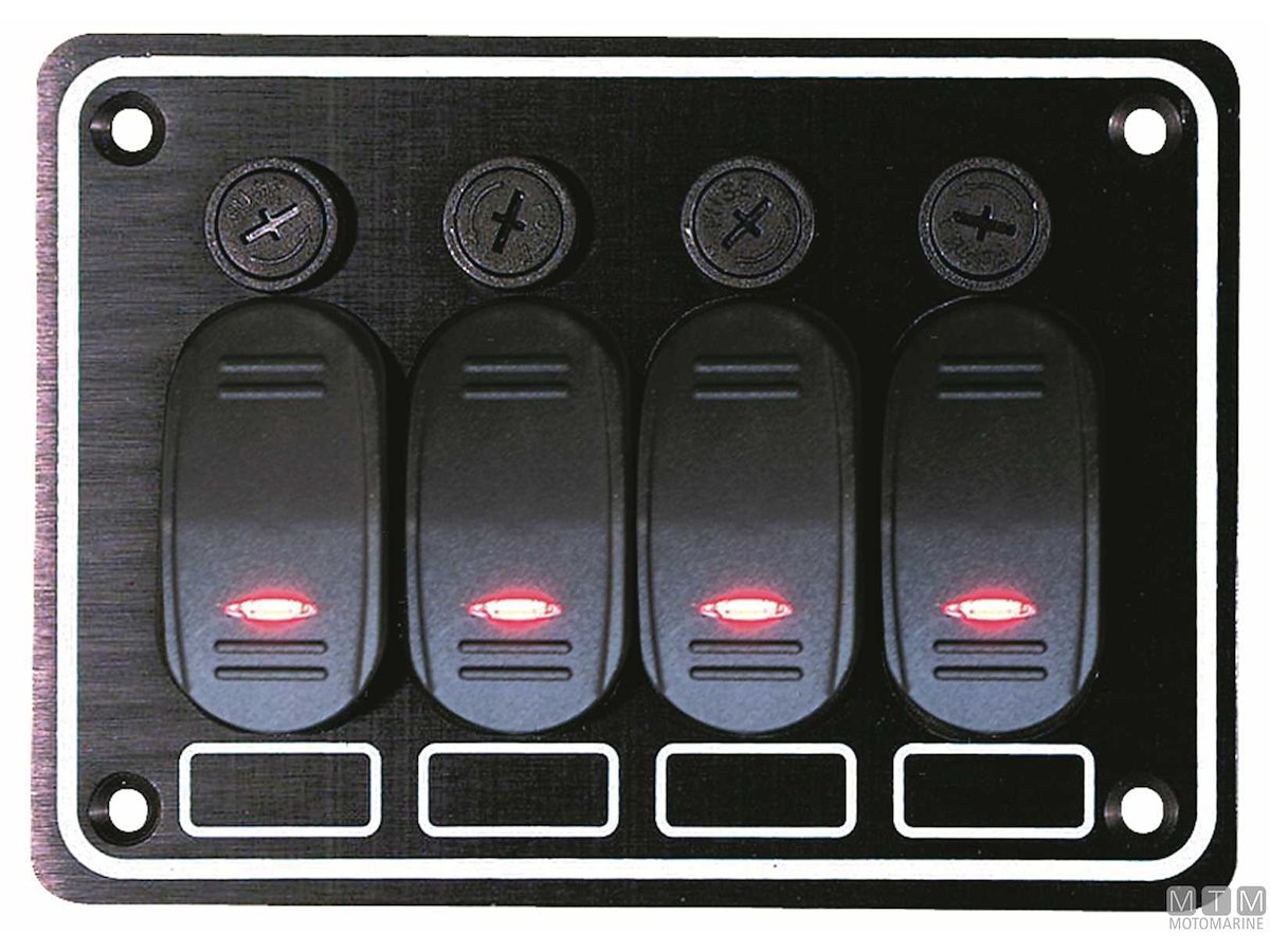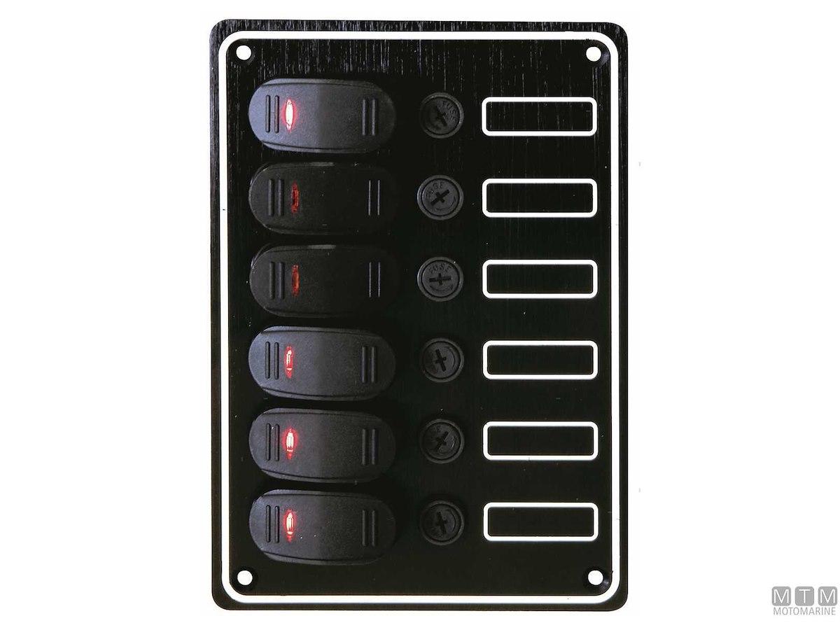 Pannello in Alluminio anodizzato impermeabile IP65 con interruttori 12V-15A, luce LED e fusibili. Completo di set etichette.