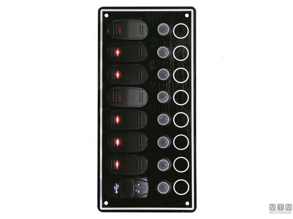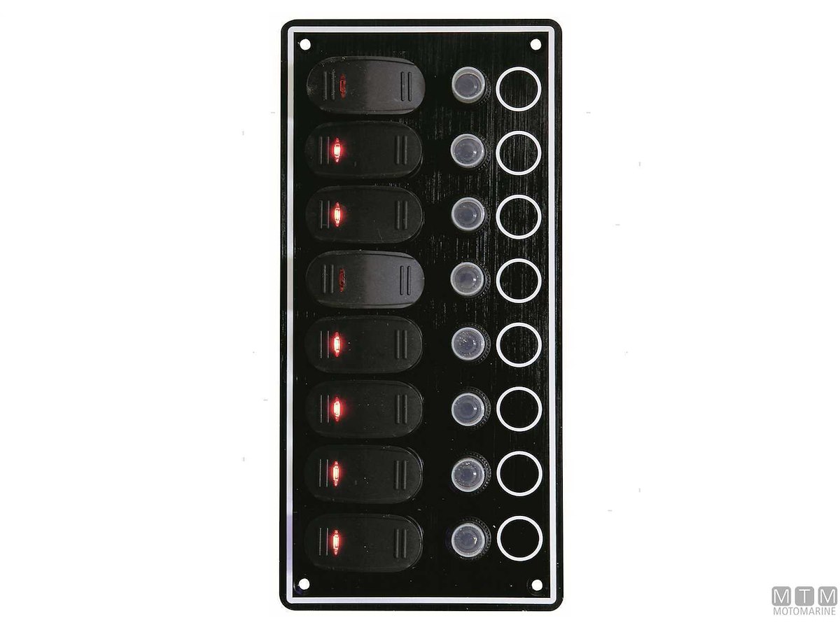 Pannello in Alluminio anodizzato impermeabile IP65 con interruttori 12V-15A, luce LED e valvole automatiche reinseribili. Completo di set etichette.