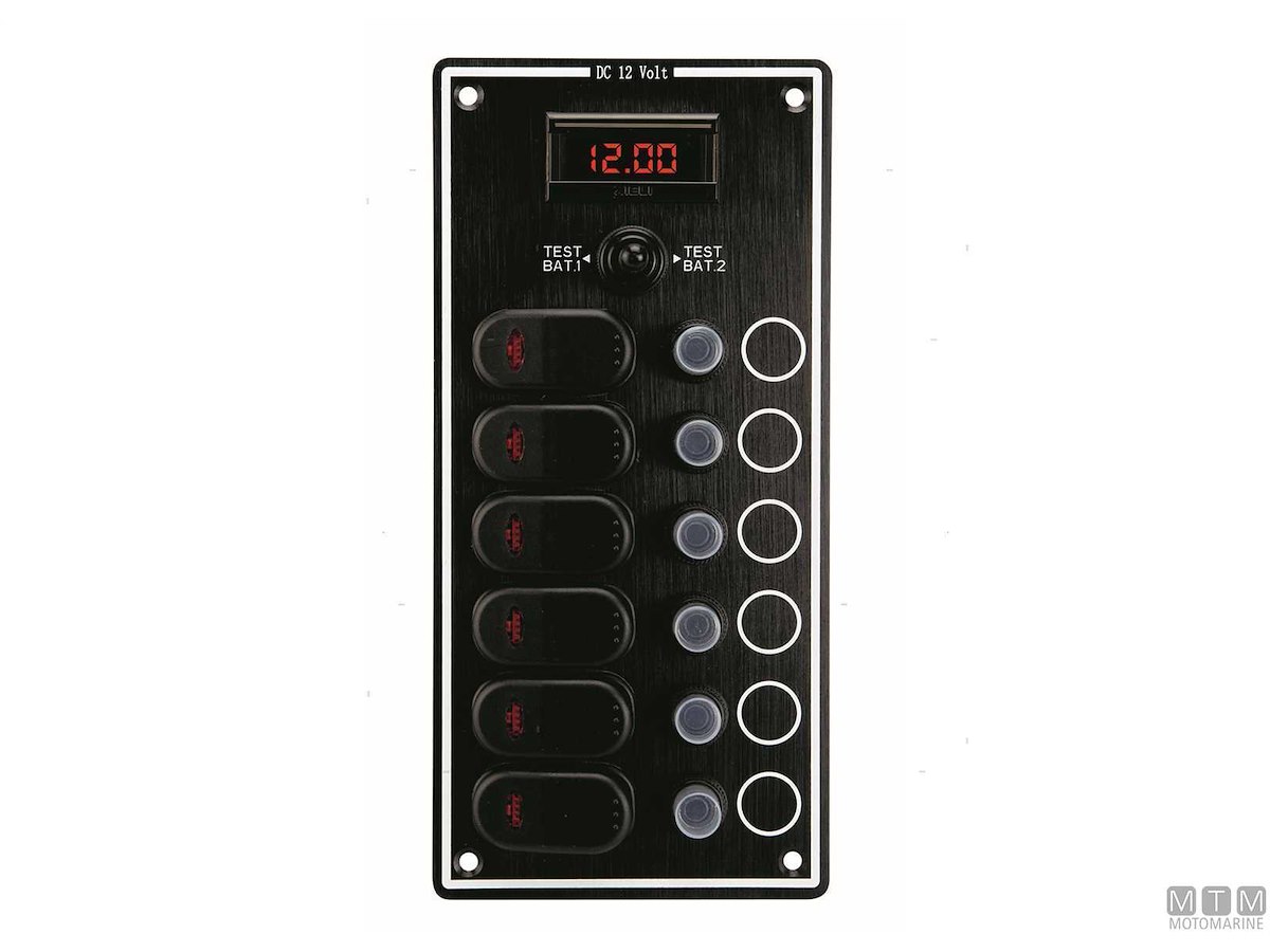 Pannello Tester in Alluminio precablato 12V con protezione IP65 ed etichette prestampate. Con indicatore digitale per il controllo di 2 batterie 12V, interruttori impermeabili dotati di spie LED e valvole automatiche reinseribili.