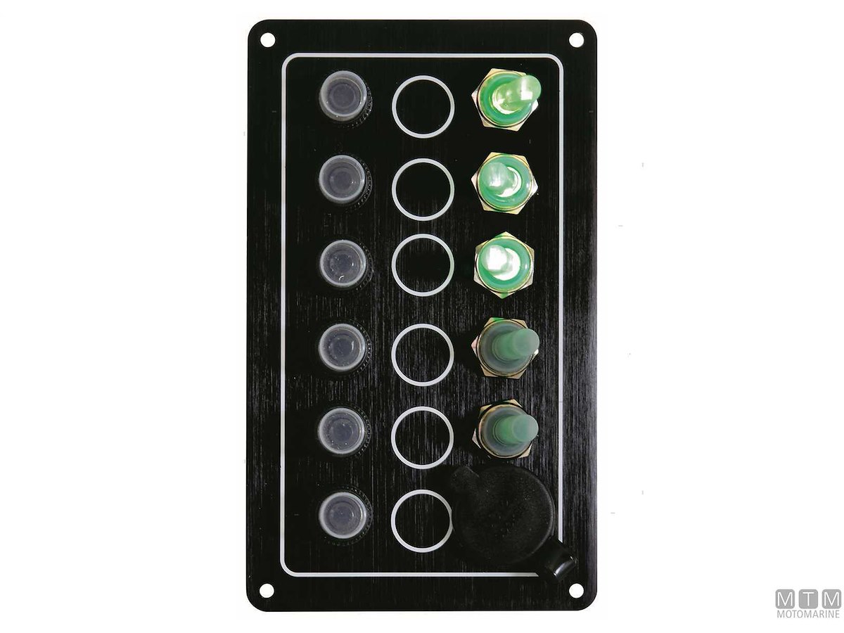 Pannello 12V anodizzato nero con interruttori impermeabili luminosi, presa 12V e valvole automatiche reinseribili completo di etichette prestampate. Il pannello ha 1 x (On)-Off e 1 x On-Off-On