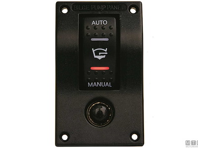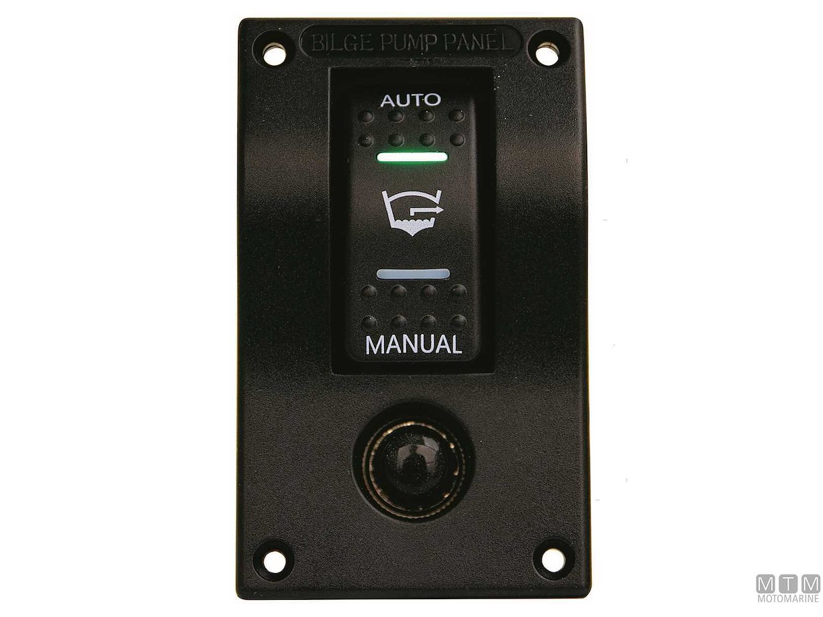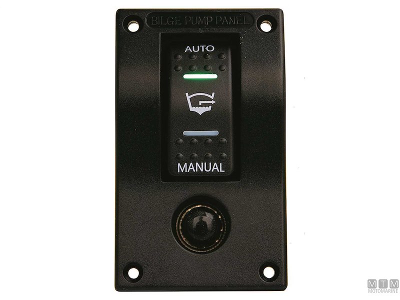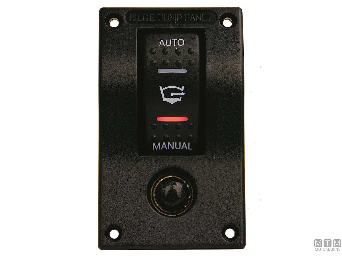 Pannello interruttore per pompe di sentina con interruttore a 3 posizioni (on)-off-on. Plastica stabilizzata resistente UV con guarnizione in Nitrile. Completo di viti, valvola automatica reinseribile da 10A e set etichette.