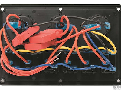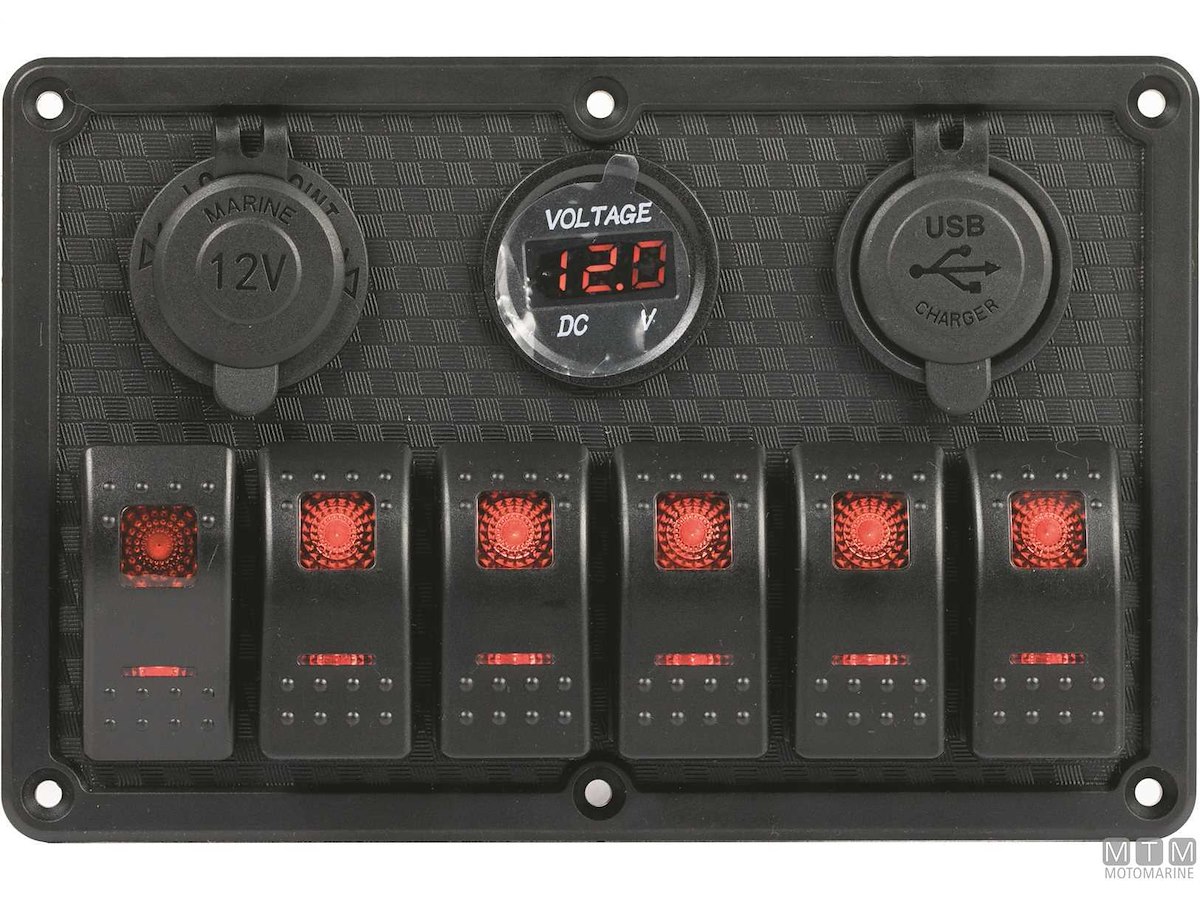 Pannello in Polimero con interruttori basculanti impermeabili a LED rossi. Il primo interruttore è (ON)-OFF per segnalazione acustica. Con voltmetro 6-30V, presa 12V e doppia presa USB 1+2.1A, tutte complete di fusibile. Precablato, completo con viti ed etichette prestampate.