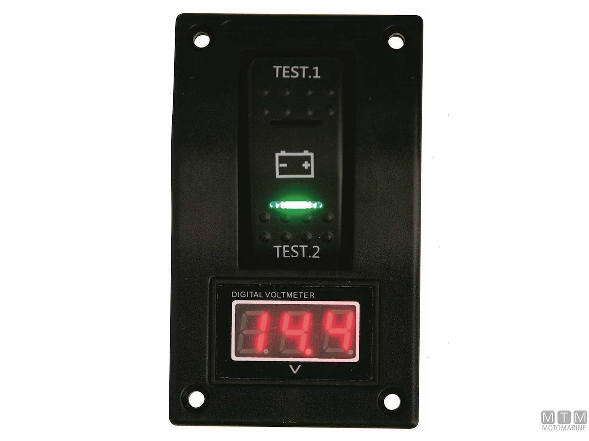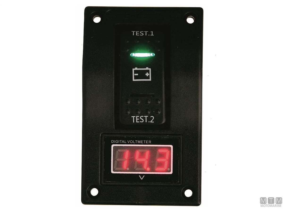 Pannello tester digitale per il controllo di 2 batterie. Plastica stabilizzata resistente UV con guarnizione in Nitrile. Con viti in Acciaio Inox ed etichetta prestampata.