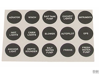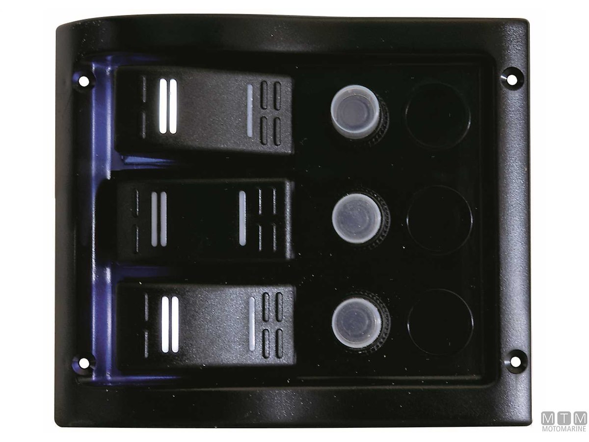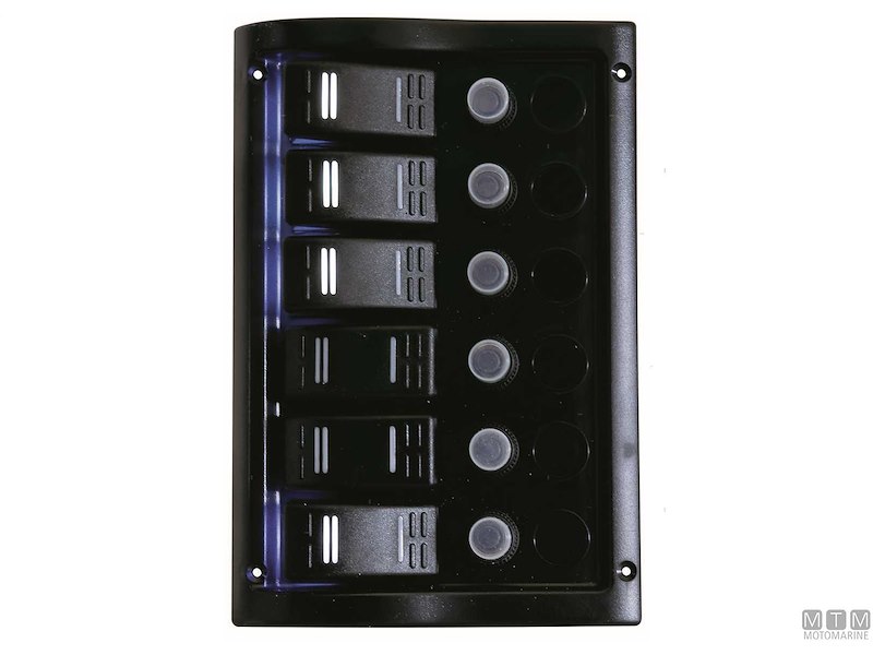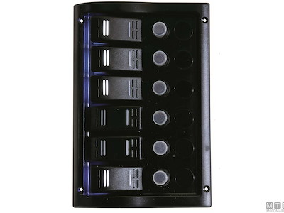 Pannello in Polimero impermeabile IP65 con interruttori 12V-16A misura Carling con luce LED e valvole automatiche reinseribili. Completo di set etichette.