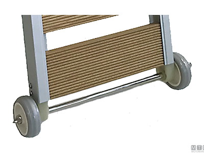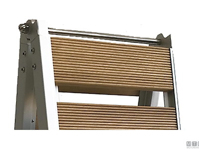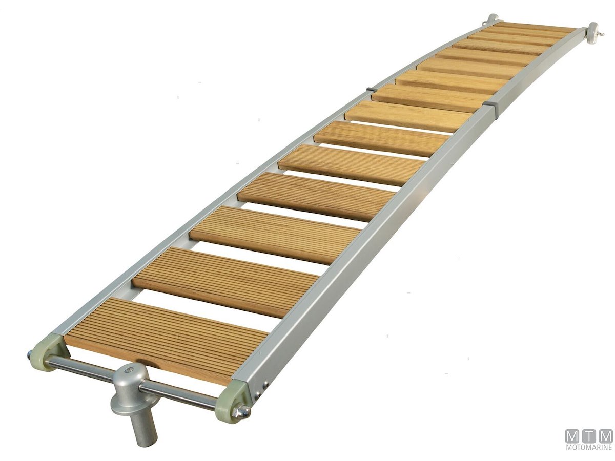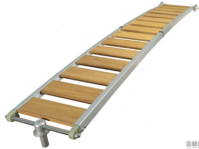 Passerella pieghevole con telaio in Alluminio Anodizzato e piano in doghe di legno marinizzato. Completa di ruote e perno.