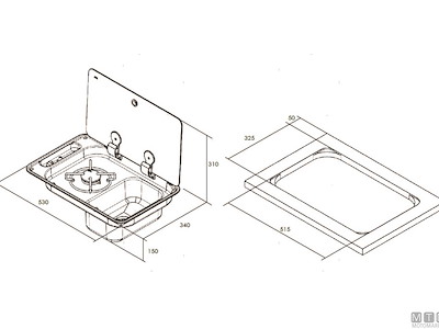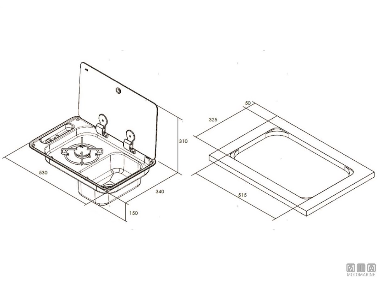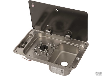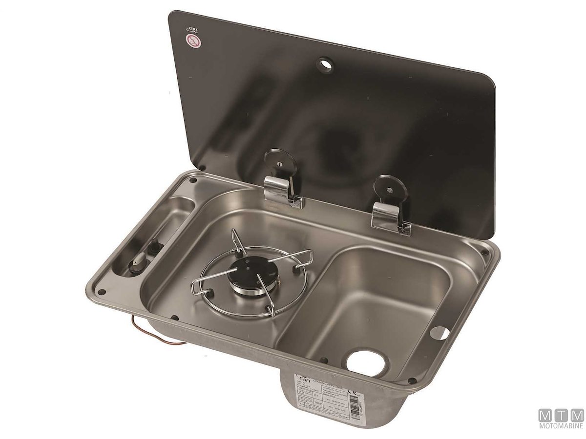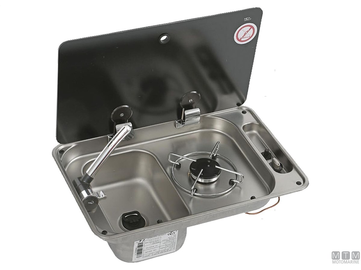 Piano di cottura a un fuoco con lavello in Acciaio Inox e elegante coperchio in Vetro nero temperato. Completo di termocoppia e accensione piezoelettrica. Completo di piletta e rubinetto.