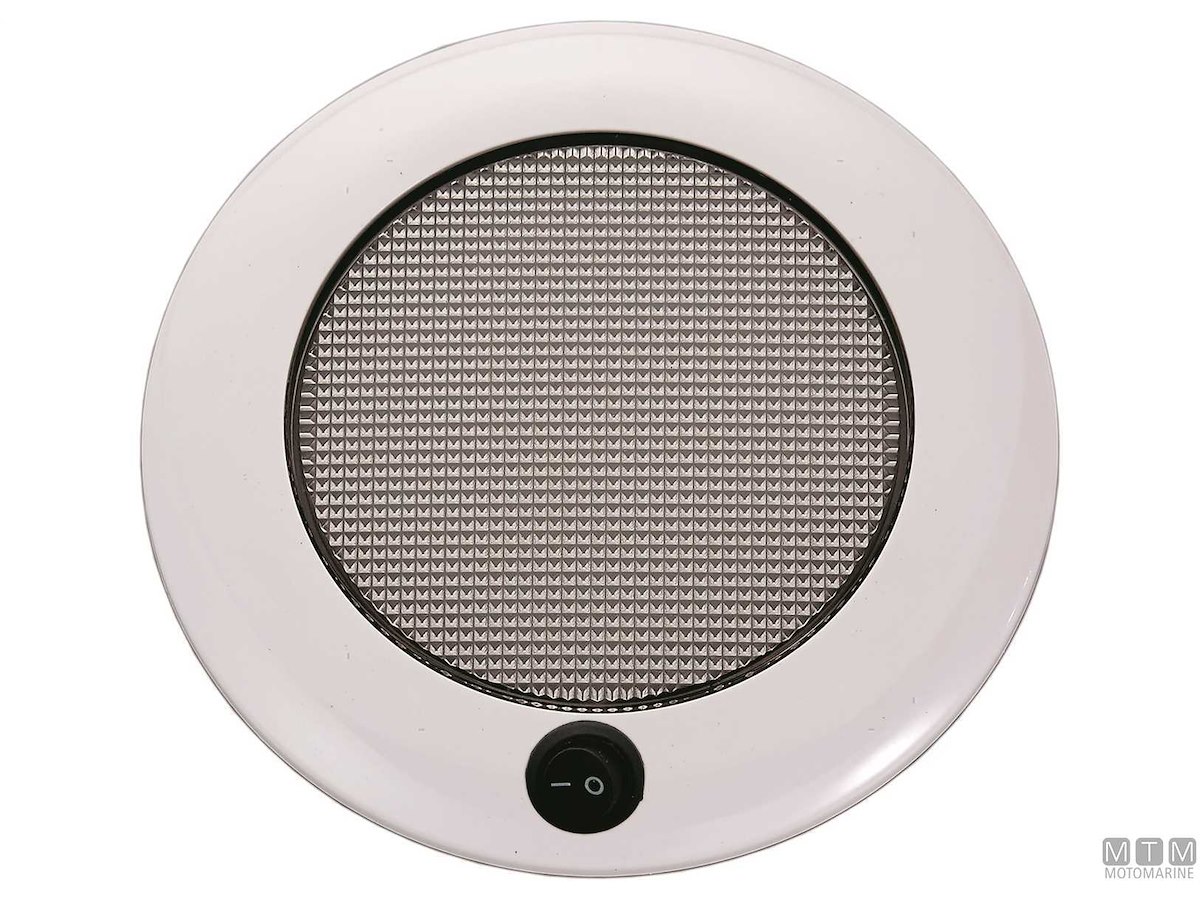 Plafoniera LED 10-30V in ABS con interruttore e funzione luce rossa per la notte. Luce bianca calda 3000°K, consumo 6W.