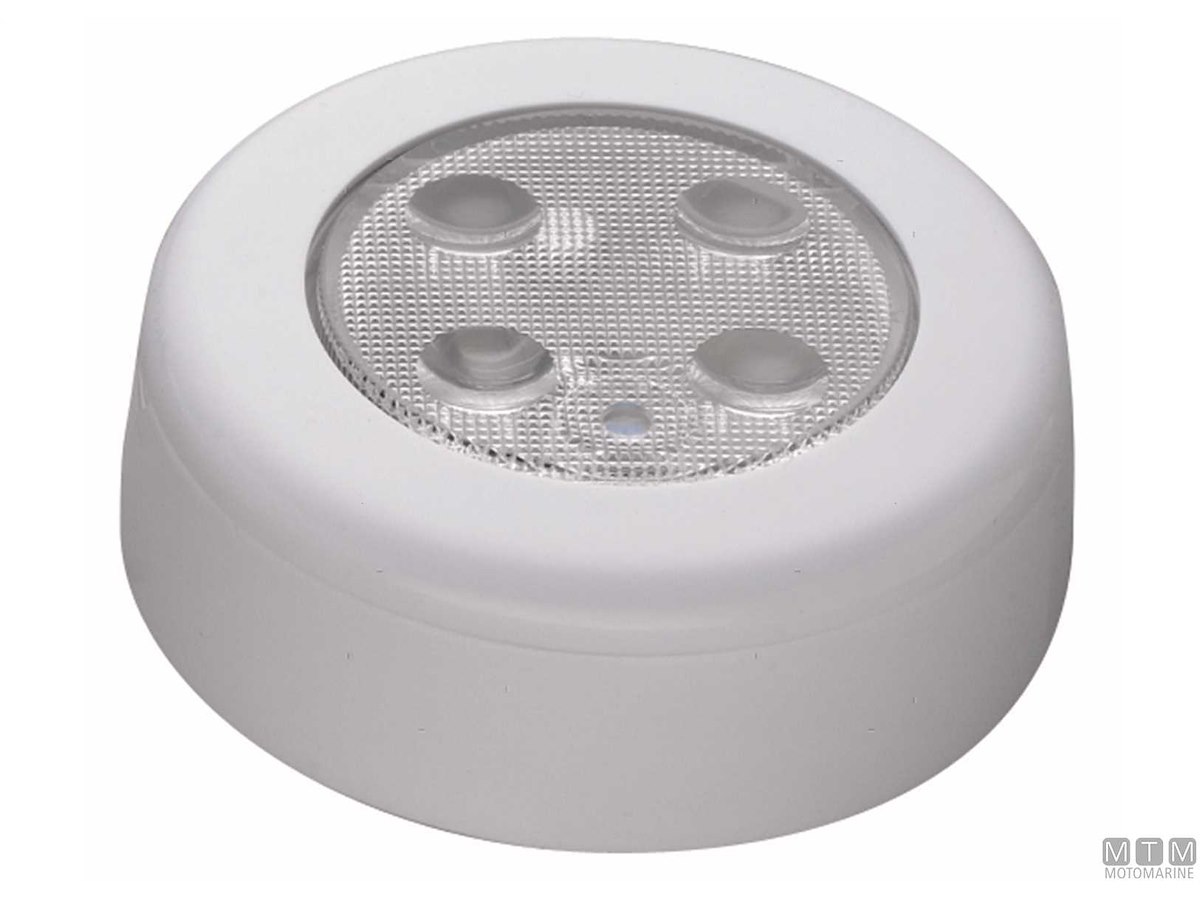 Plafoniera LED 12/24V con corpo in plastica bianca, si aziona premendo la lente.