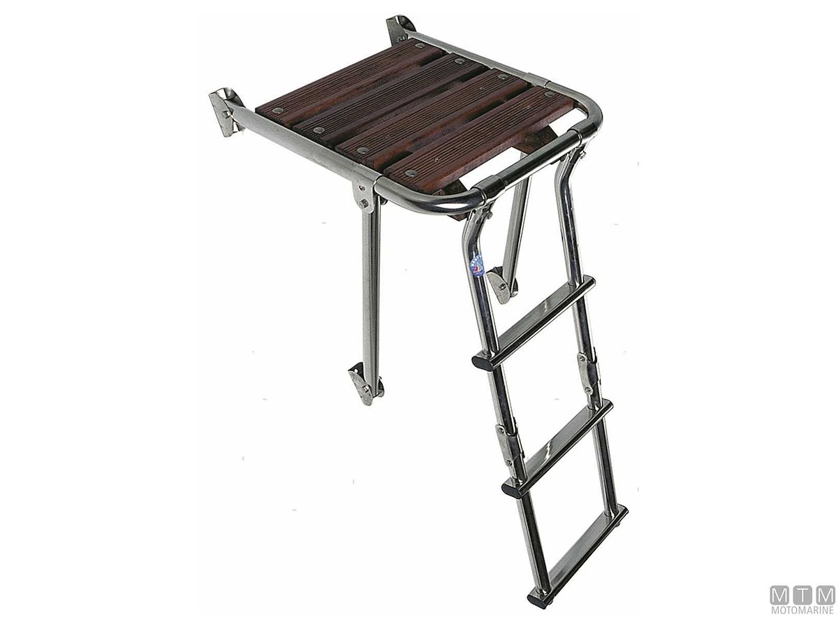 Plancetta di poppa in doghe di legno marino con telaio in Acciaio Inox e scaletta pieghevole.