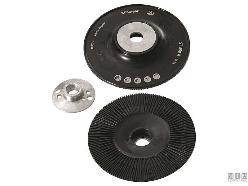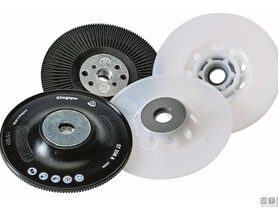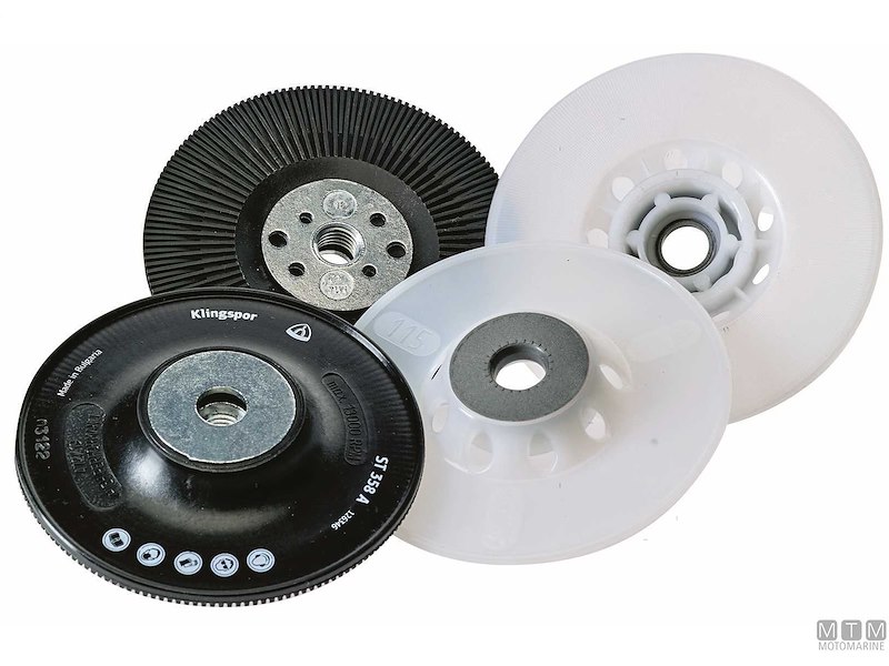 Platorelli di supporto per dischi abrasivi. ↵Dischi velcrati: platorello con velcro e vite passante. ↵Dischi fibrati: platorello in Nylon rinforzato con ghiera.