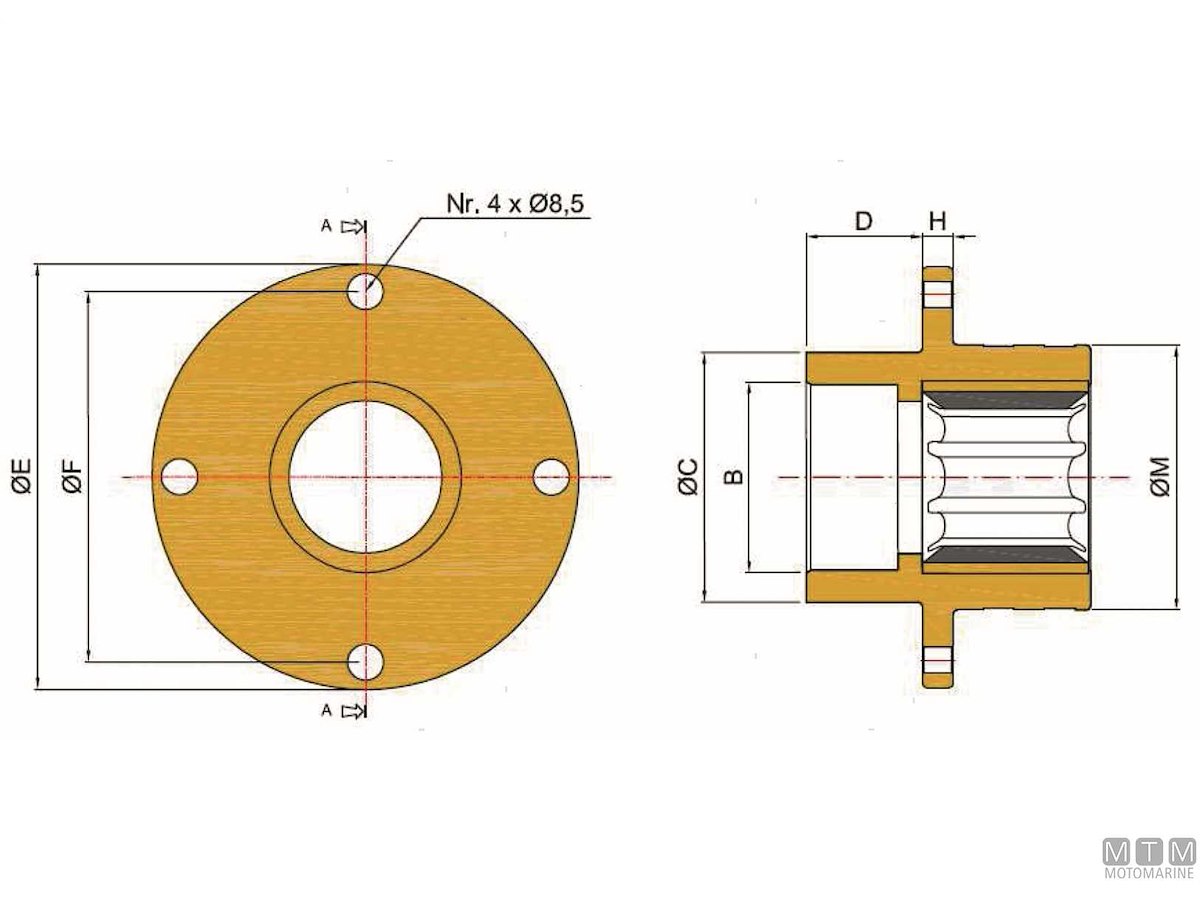 Teste portatenuta in Bronzo per tenute meccaniche Tor MM complete di boccola idrolubrificate a canali assiali e di portagomma per l'idrolubrificazione con acqua di mare. L'incasso è già filettato per tubi astuccio di assi portaelica da 35 a 80 mm. Cod.: 4900650 Asse ø mm: 50 M mm: 87 B mm: 54 x 1,5 C mm: 82 E mm: 138 F mm: 120 D mm: 38 H mm: 10