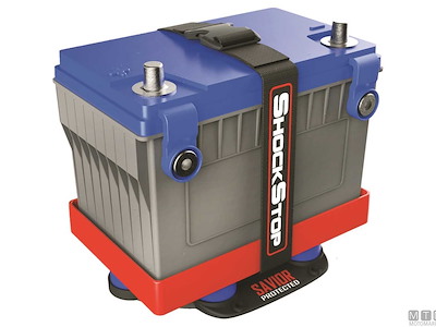 Portabatteria con piastra portante ammortizzata. Previene danni da urto e vibrazione alla batteria prolungandone l'efficacia e la durata. Ideale per barche veloci e navigazione d'altura. La forma a contenitore fornisce inoltre protezione da eventuali perdite di sostanze chimiche. Completa con gancio e cinghia elastica a strappo.