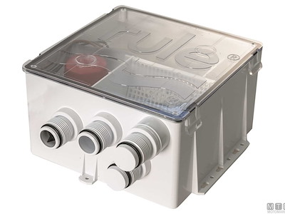 Pozzetto raccolta e scarico doccia Rule con pompa automatica e interruttore galleggiante. Prevalenza massima 2,7 metri, bocca di scarico filettata 1" con valvola di non ritorno. Tre bocchette di aspirazione filettate 1" di cui una con portagomma per eventuali tubi da 38 mm. Completo con tre raccordi filettati da 1" con portagomma da 20 mm, un raccordo da 25 mm e uno da 30 mm.