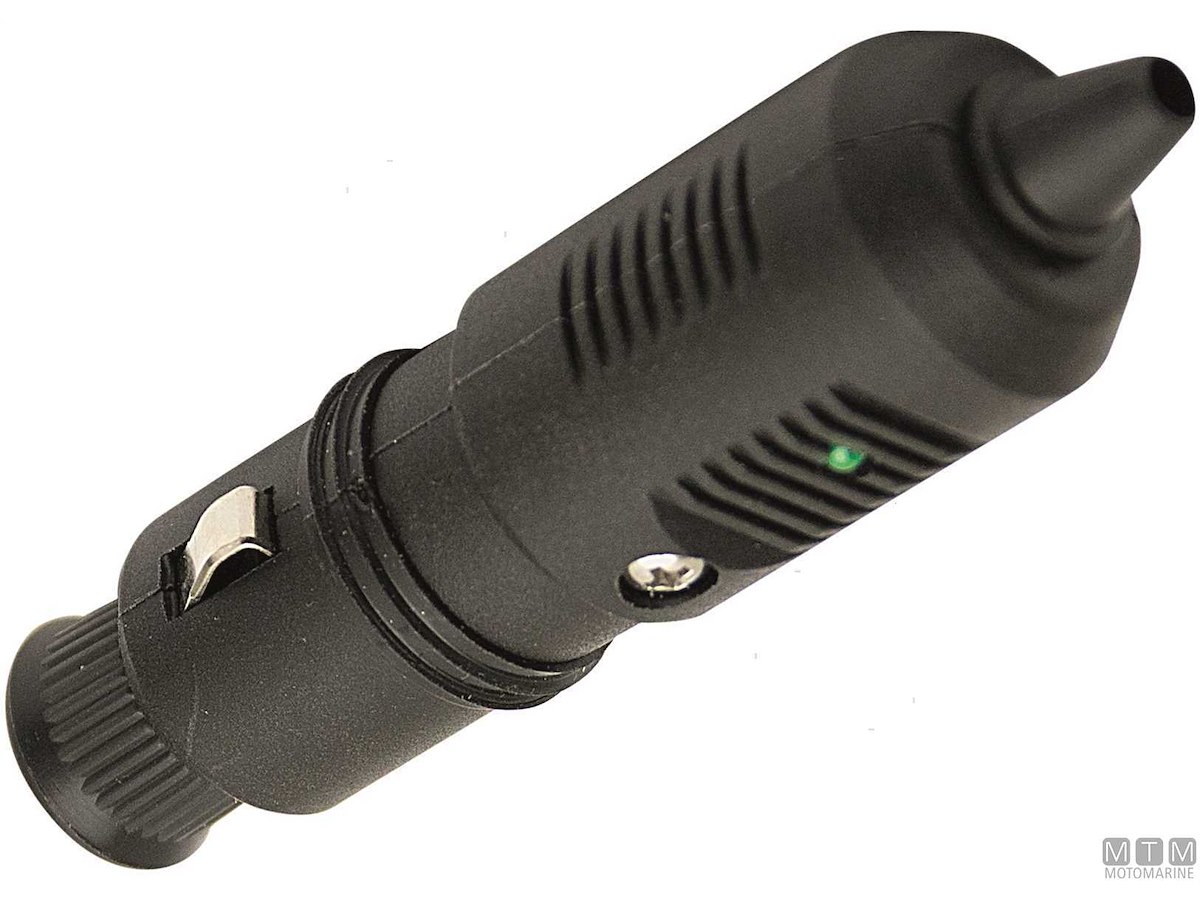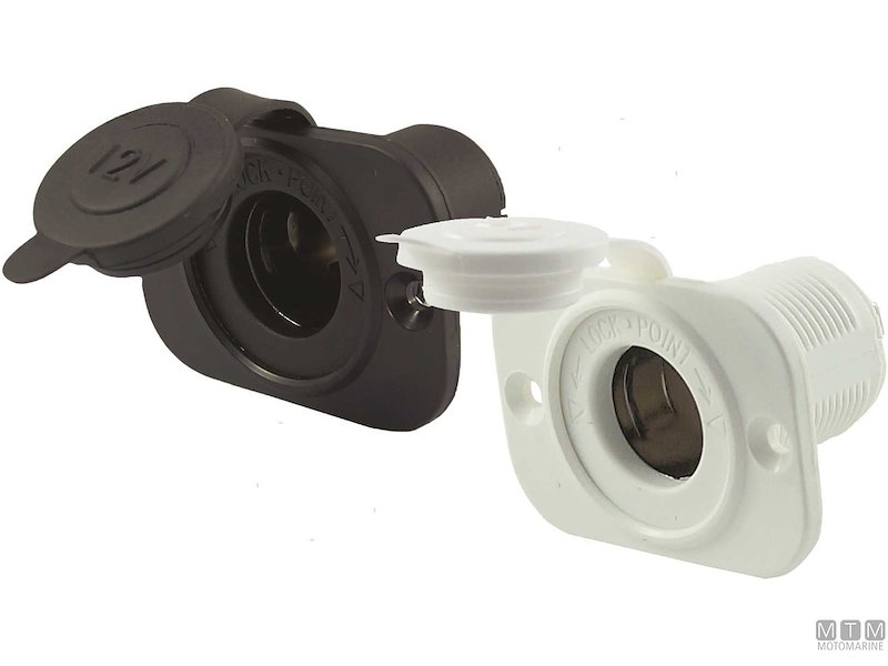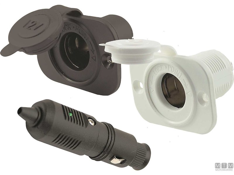 Presa e spina 12V tipo accendino impermeabile in Nylon rinforzato stabilizzato UV con sistema di blocco a rotazione e cappuccio stagno. Spina completa di LED e fusibile sostituibile. Dimensioni 50 x 60 x H43 mm.