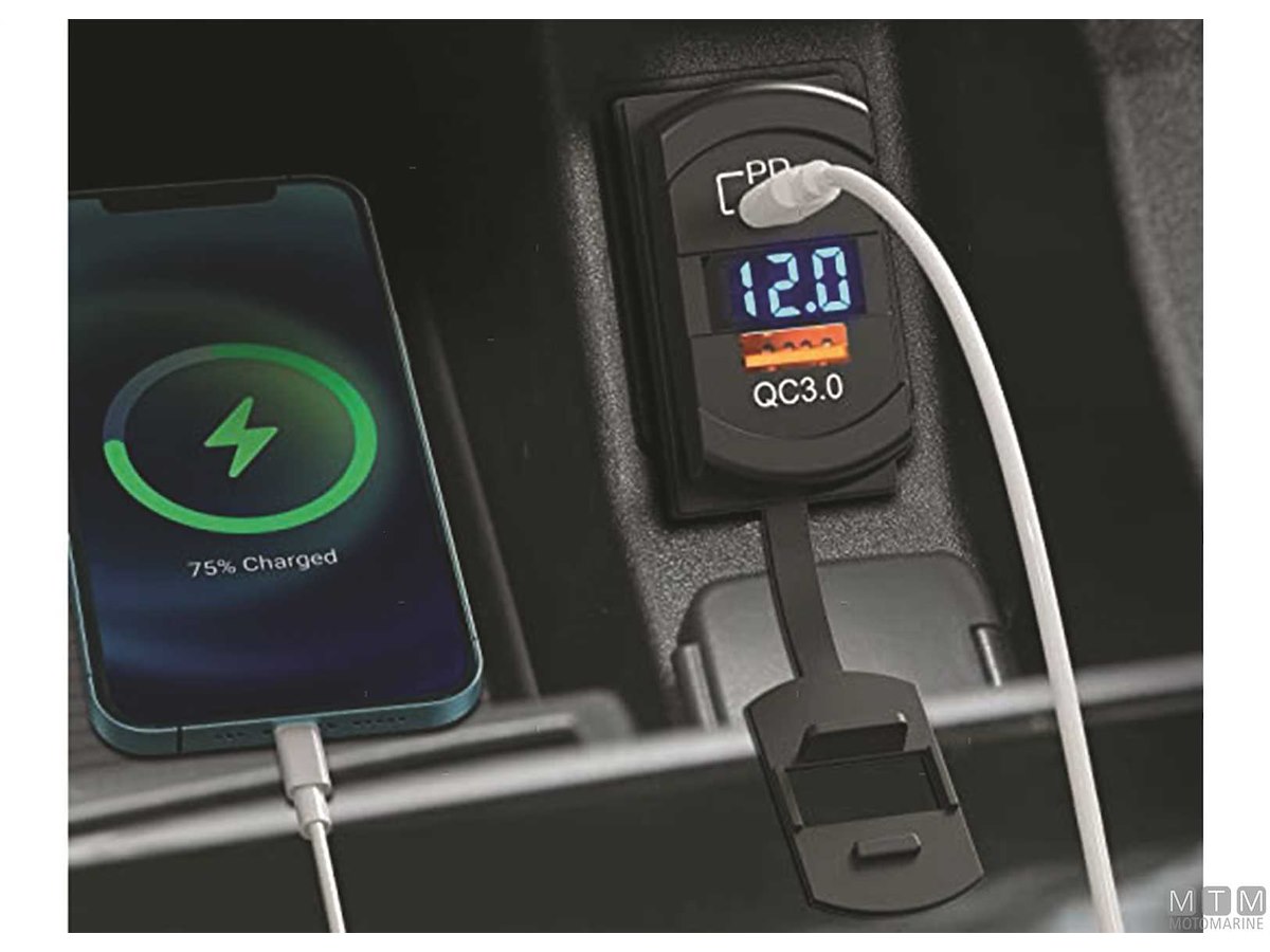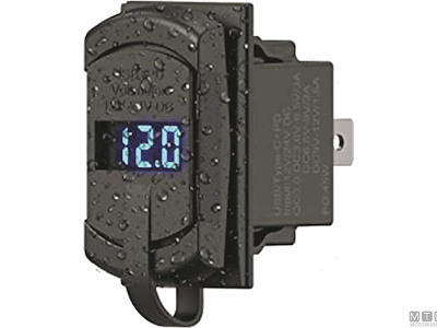 Presa USB 3.0A e Type-C impermeabile IP65 completa di voltmetro, luce LED blu e cappuccio di protezione. Grazie alle misure tipo Carling si inserisce alla perfezione su un qualsiasi pannello a interruttori.