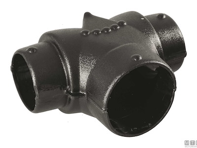 Raccordi splitter in PVC per dividere il flusso d'aria in due condotte separate. La versione a T è provvista di deflettore interno per regolare il flusso d'aria tra le due condotte a valle.