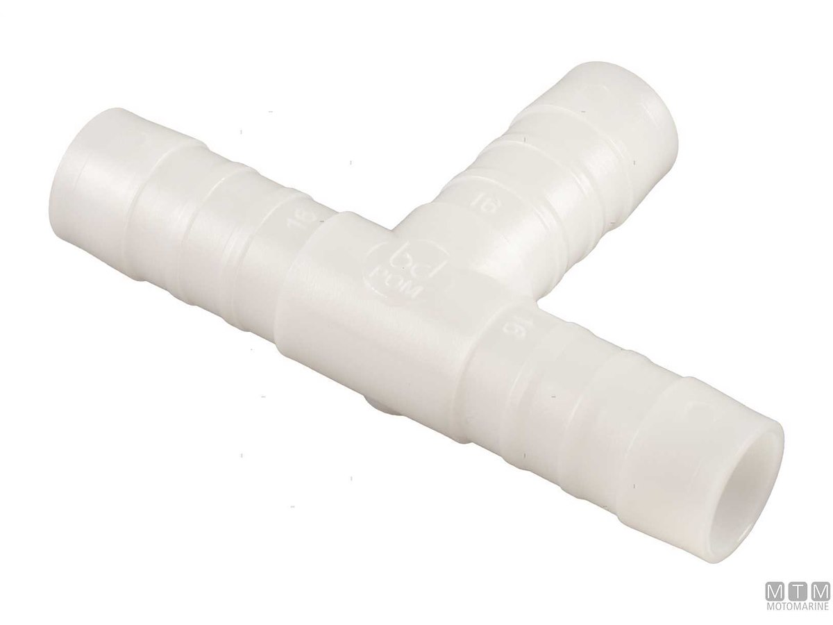 Raccordo portagomma in Polimero di Resina Acetalica per impianti di acqua dolce, di scarico e di mare. Passaggio interno dei fluidi liscio senza spigoli con pareti a spessore per resistere agli urti, assenza di corrosione, pressione di esercizio 10 bar a max 85 °C.