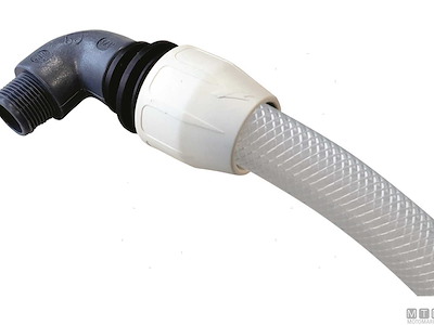 Raccordo a gomito ad innesto rapido in Polipropilene caricato. Connette velocemente qualsiasi tipo di tubo flessibile ed elimina la fascetta stringitubo. Tenuta stagna fino a 16 bar.
