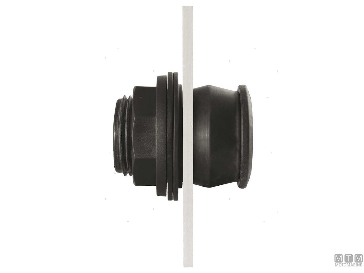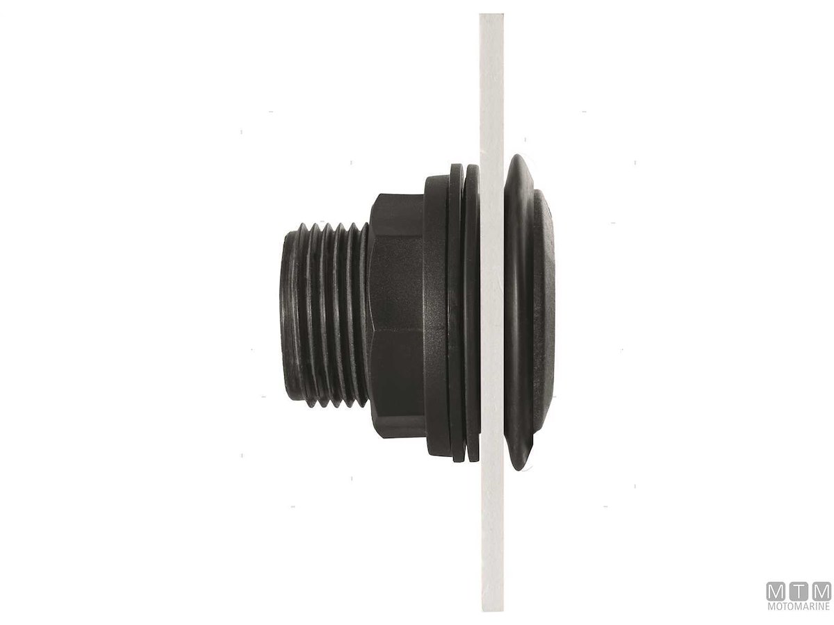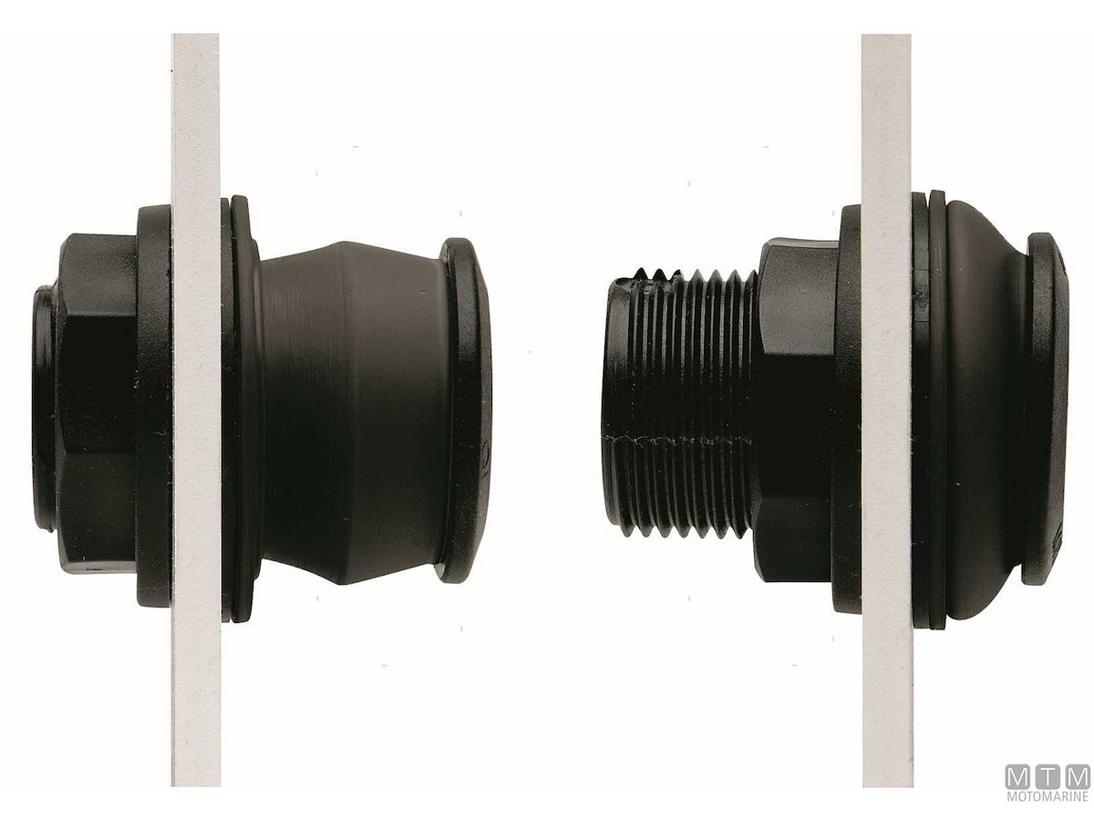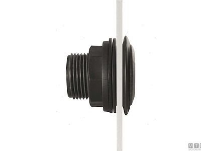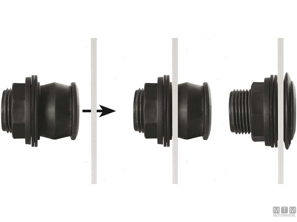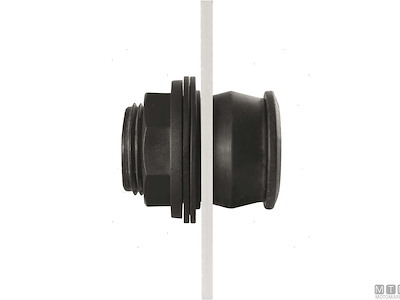 Raccordo a innesto rapido in Polipropilene (dado grigio: per acqua) con guarnizione in EPDM alimentare per ogni tipo di serbatoio acqua. Montaggio dall'esterno con un semplice foro. Quando il raccordo viene avvitato, la guarnizione si comprime e garantisce una tenuta stagna.