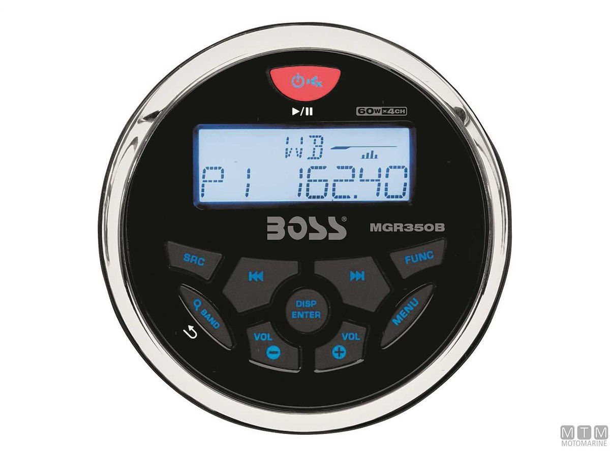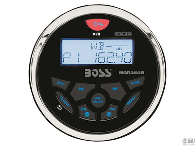 Radio lettore tondo da cruscotto compatto ma potente BOSS MGR350B con display LCD. Radio FM/AM sintetizzata, presa USB e ingresso AUX posteriori. Impemeabile IPx6. Bluetooth integrato per audio streaming da MP3 o smartphone. Compreso di cavi di collegamento.