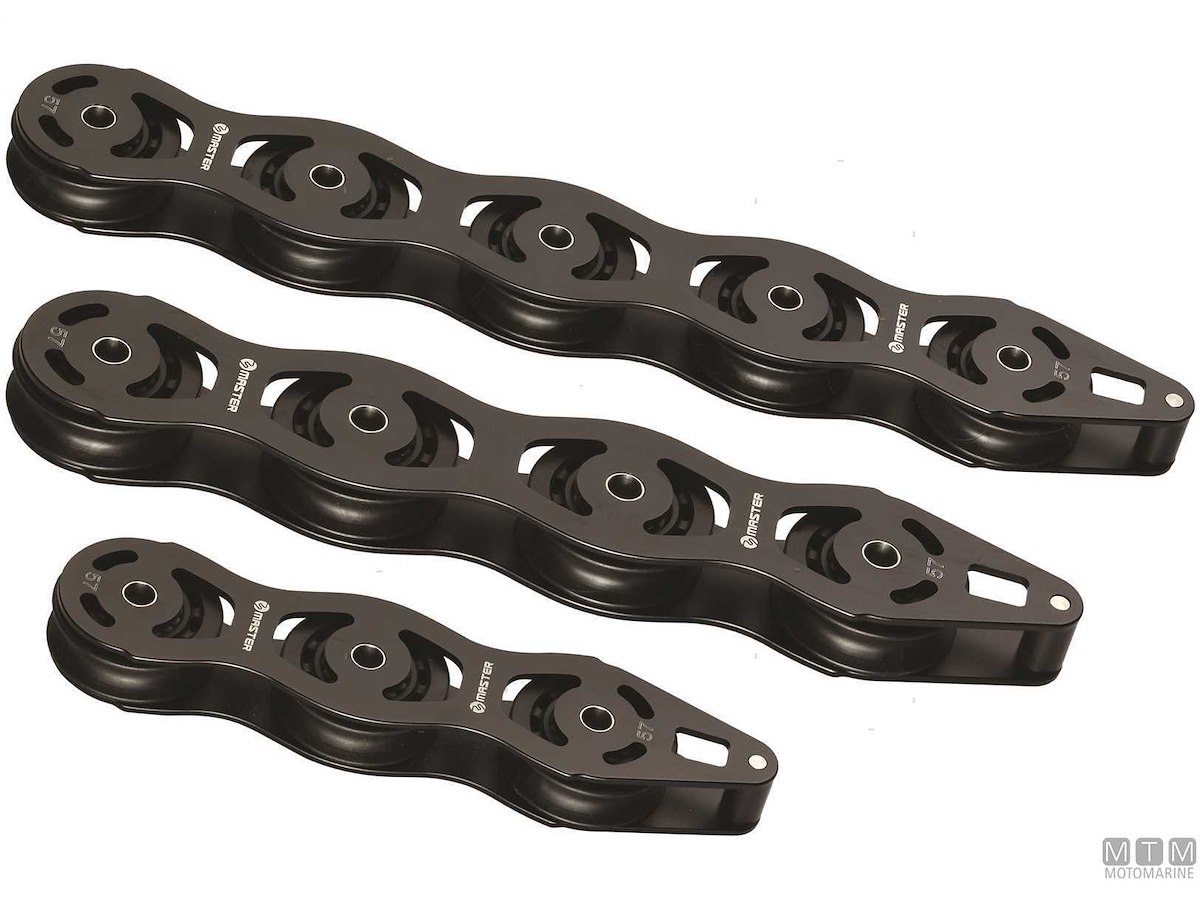 Deck organizers Hercules con pulegge da 57 mm e cassa in Alluminio anodizzaro nero. Cuscinetti su sfere ad alto scorrimento in Delrin stabilizzato UV. Interasse pulegge 78,5 mm. Eccezionale resistenza al carico.