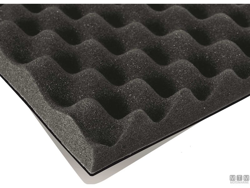 Rivestimento isolante adesivo bugnato fonoassorbente ed impermeabile, isola dal rumore ed è facile da applicare. Lastre adesive leggere in poliuretano espanso autoestinguente trattate con polimero impermeabile all'acqua e all'olio. Cod.: 3317042 >||< mm: 20 dB: 10 cm: 100 x 200