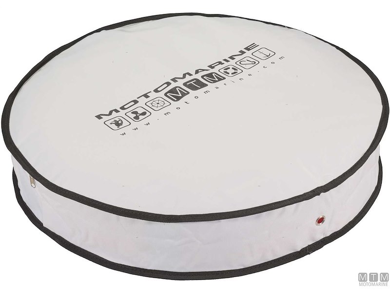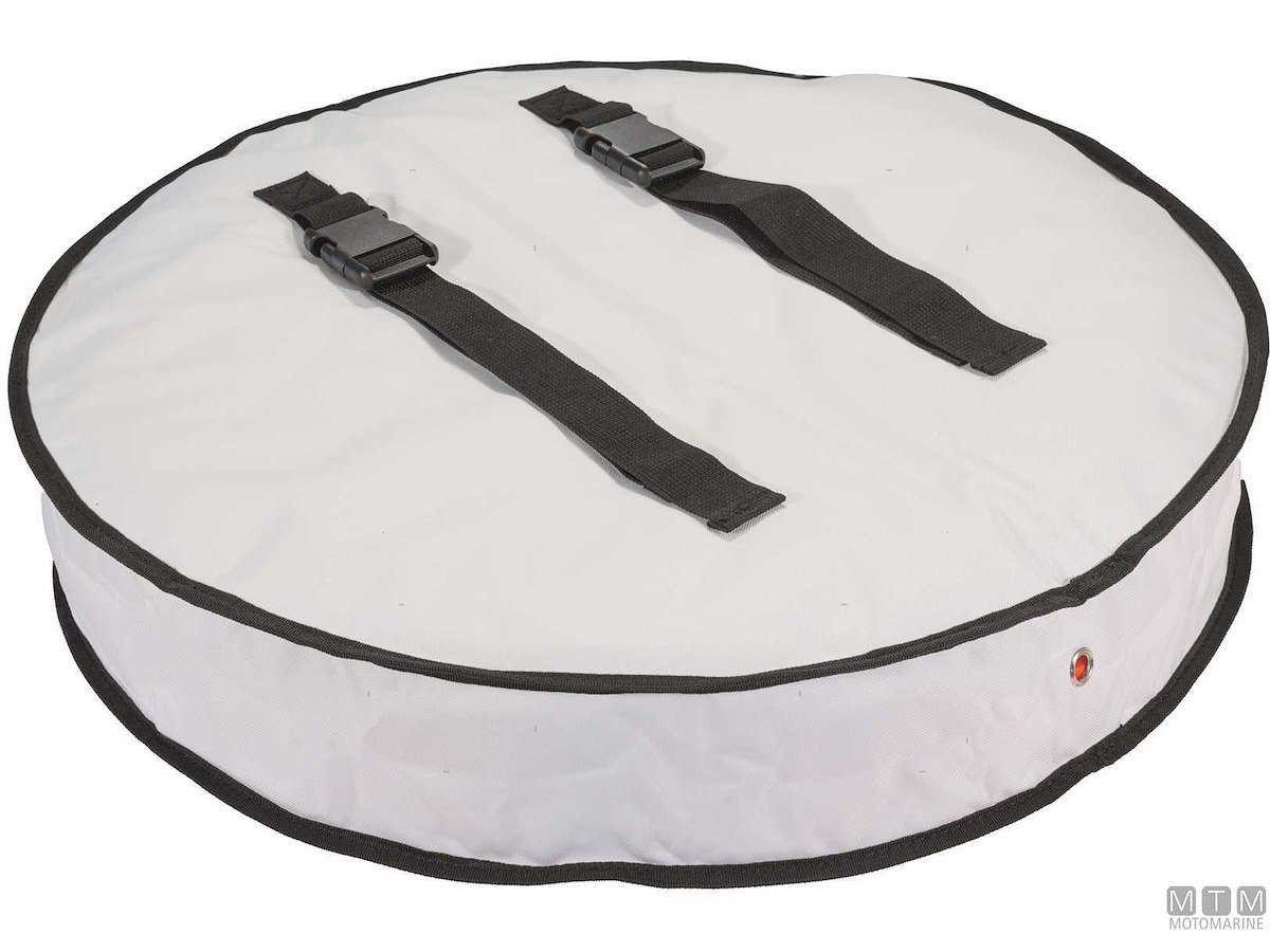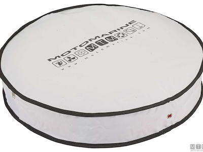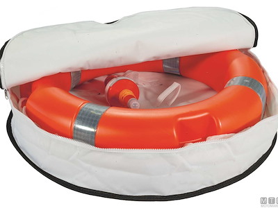 Sacca per salvagenti anulari in tessuto di poliestere imbottito con strato interno di PVC, cinghie di fissaggio regolabili e apertura a cerniera. Può contenere un salvagente anulare da 600 mm con boetta e sagola.