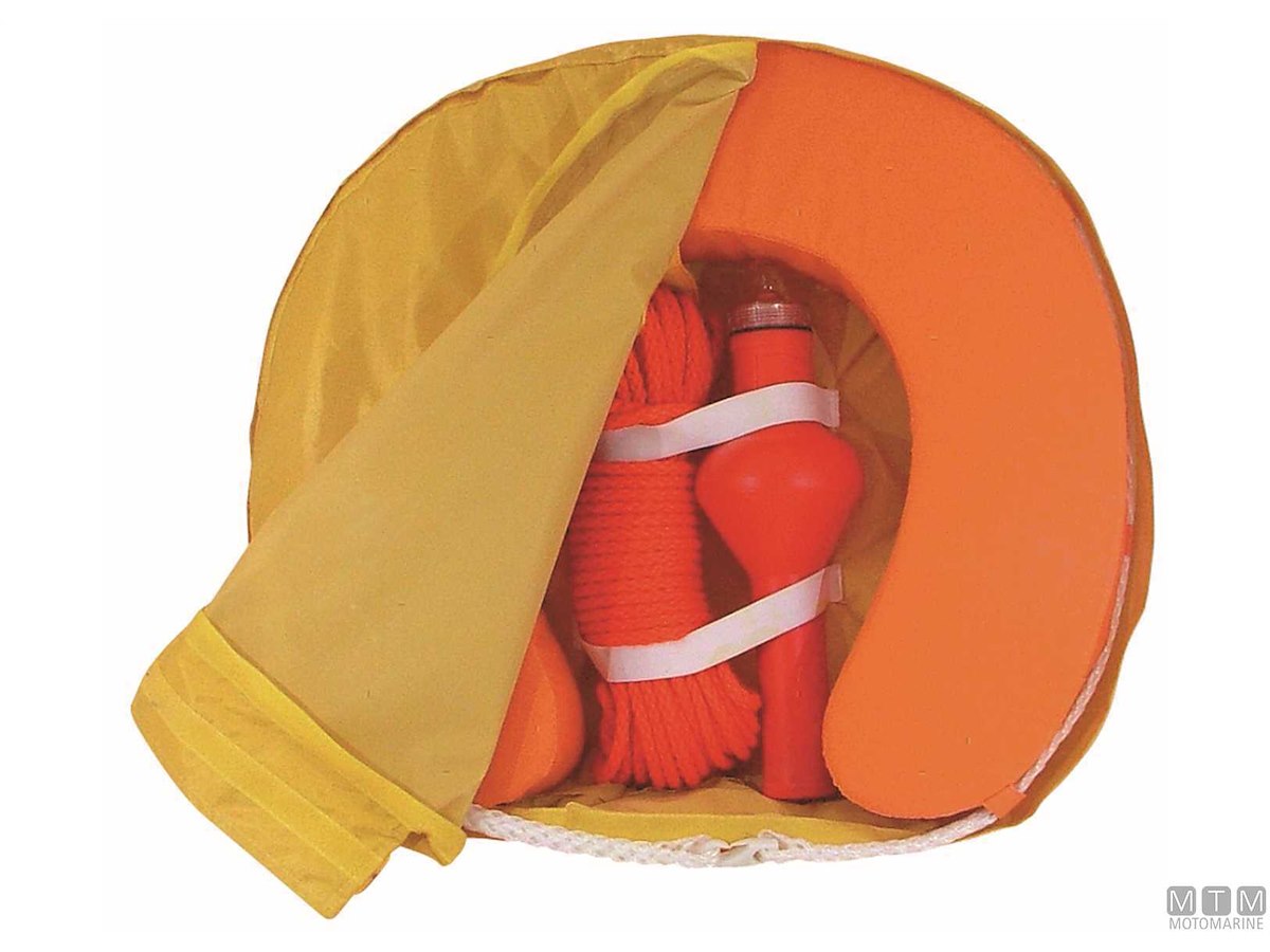 Salvagente a ferro di cavallo con copertura levabile a cerniera. Completo di boetta MED e sacca impermeabile di protezione con sistema di attacco. Non omologato.