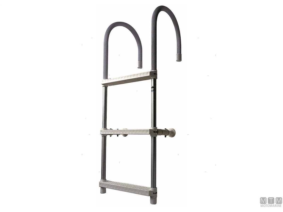 Scalette in tubo di Alluminio Anodizzato da 25 mm con gradini in Plastica rinforzata anti scivolo, distanziali regolabili e rimovibili e curve d'attacco girevoli. W=26 cm. Larghezza 37 cm.