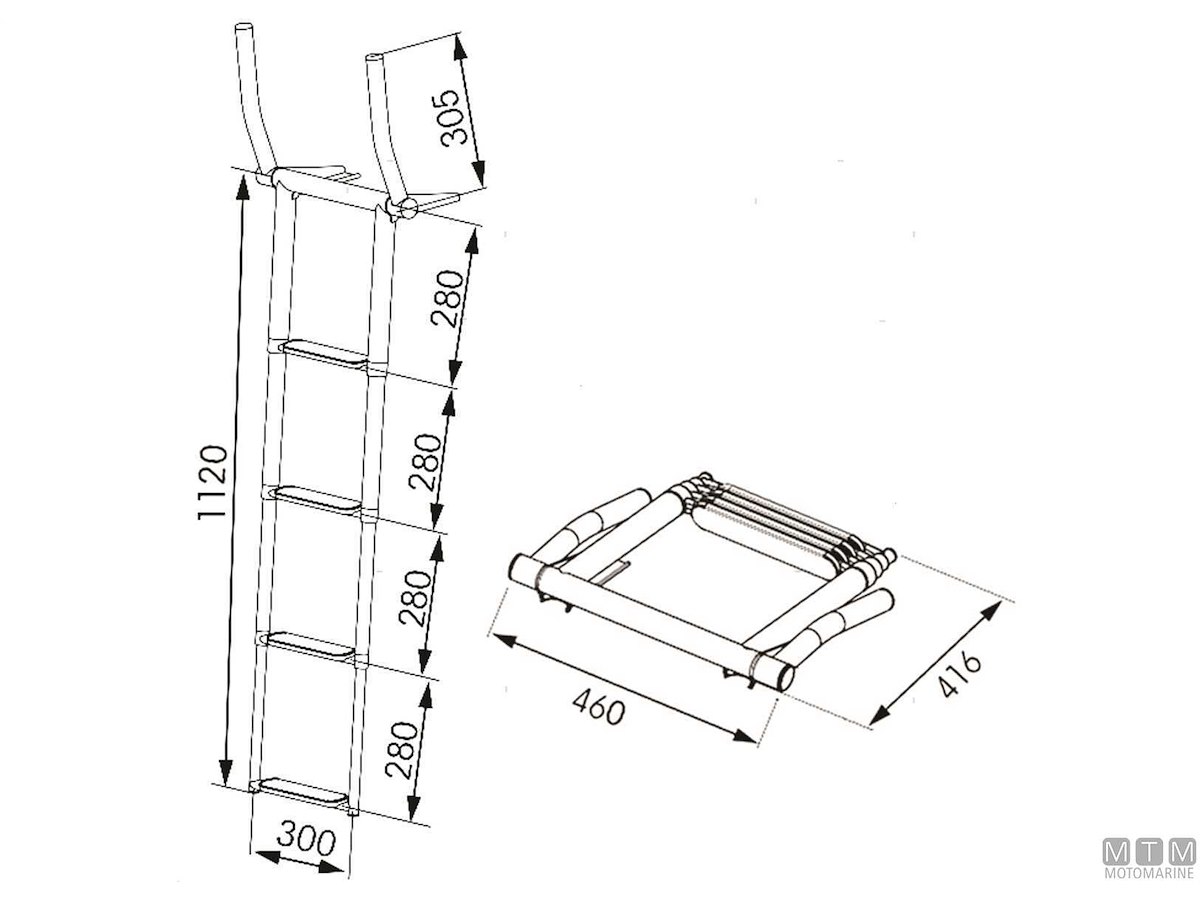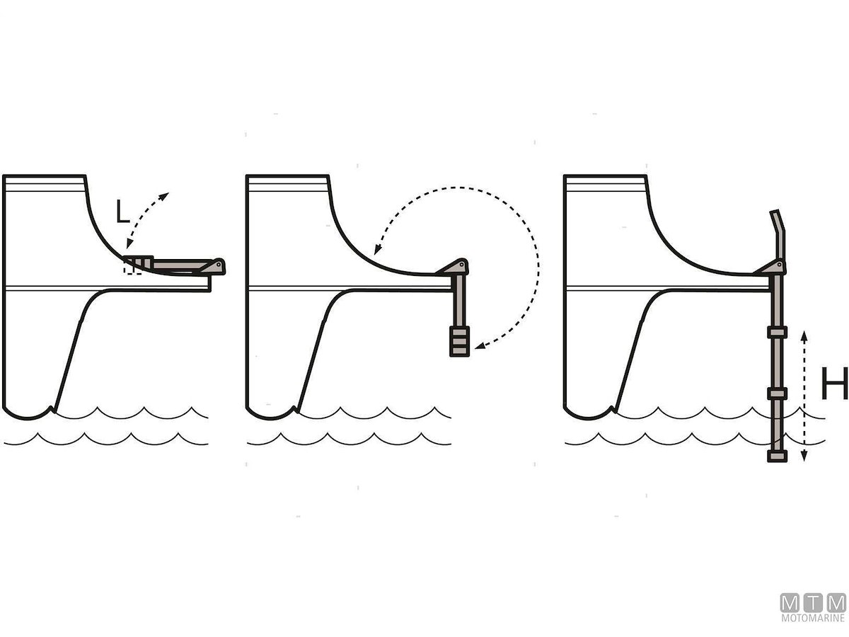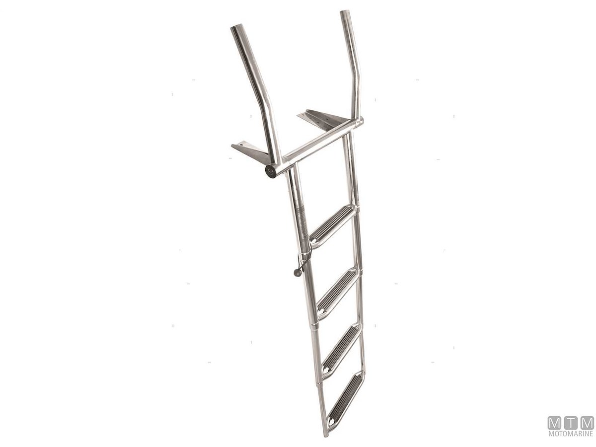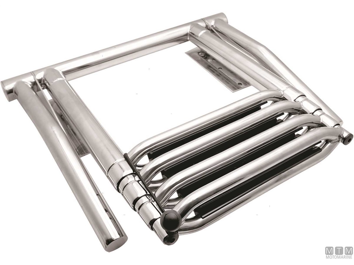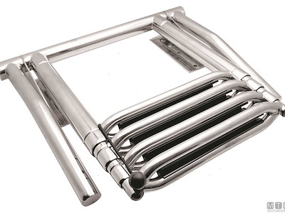 Scalette telescopiche ribaltabili in Acciaio Inox con passamano abbattibile. Gradini rivestiti per un maggiore comfort. Montaggio su plance e plancette. Altezza passamano 30 cm.