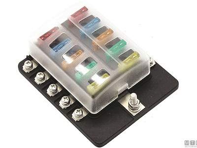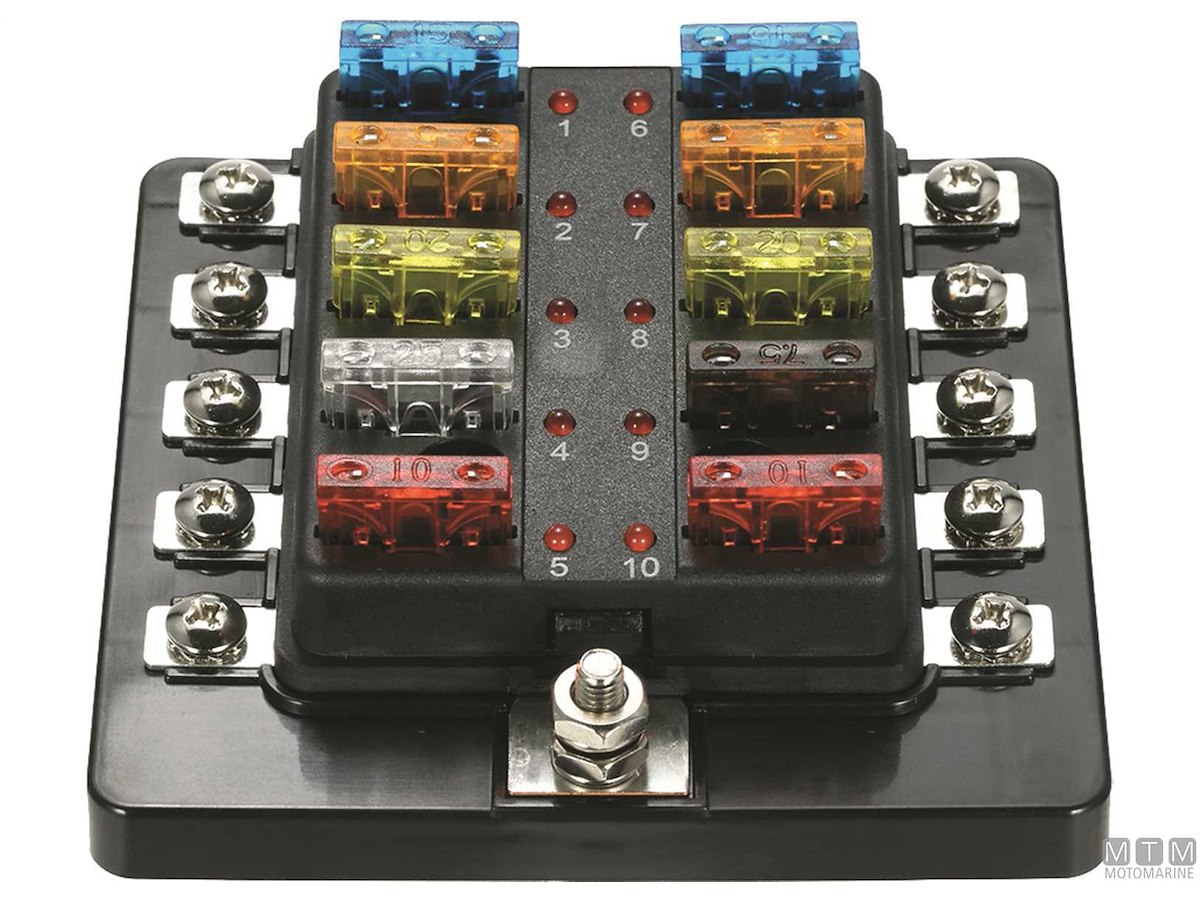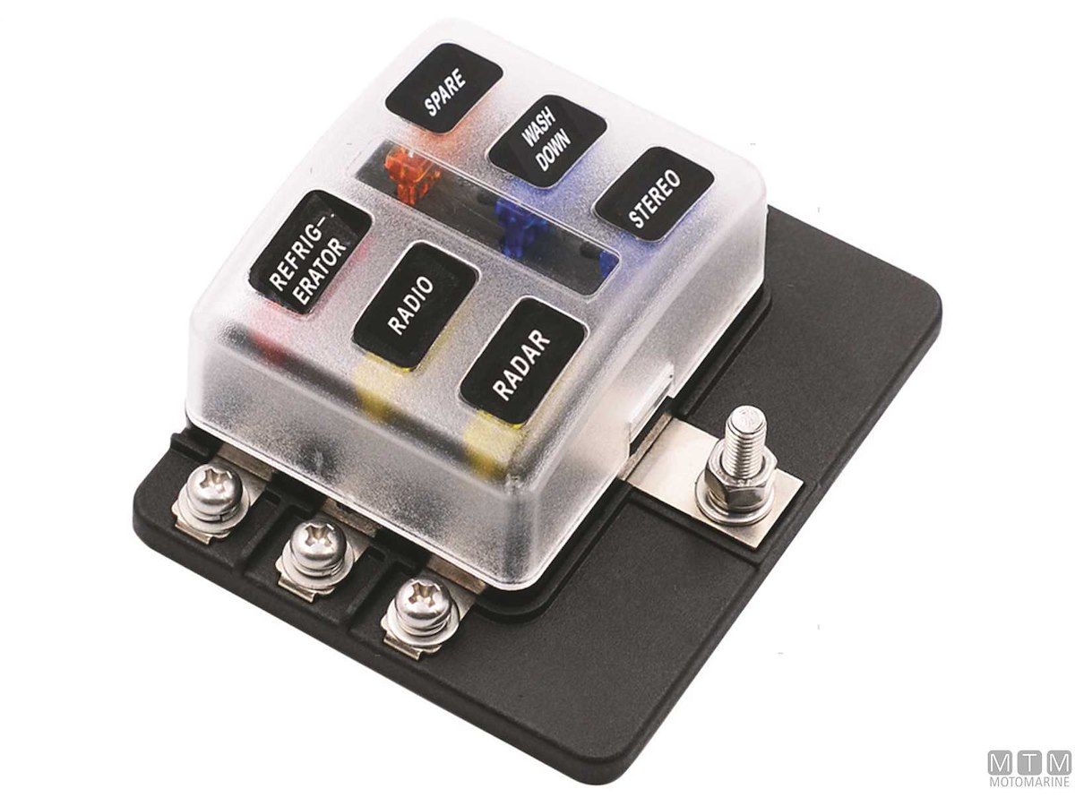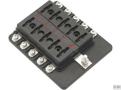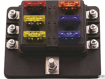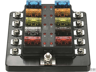 Scatola portafusibili lamellari standard (Unival) con positivo comune.  Indicatore LED di allarme che si attiva in caso di fusibile interrotto. Copertura di protezione trasparente. Etichette adesive con simboli utenza.  Terminali a vite per una maggiore sicurezza.