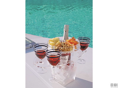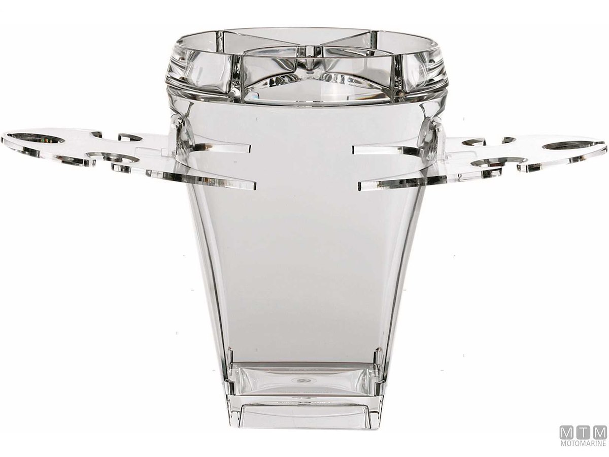Secchiello per champagne con alette portabicchieri e portasnack. In Acrilico garantito 100% per uso alimentare. Lavabile in lavastoviglie, infrangibile e anti-macchia.