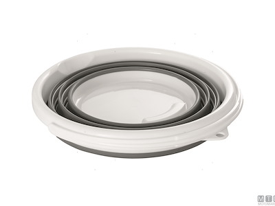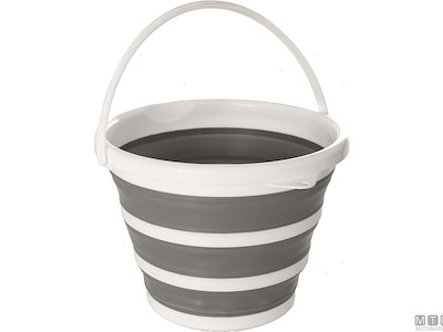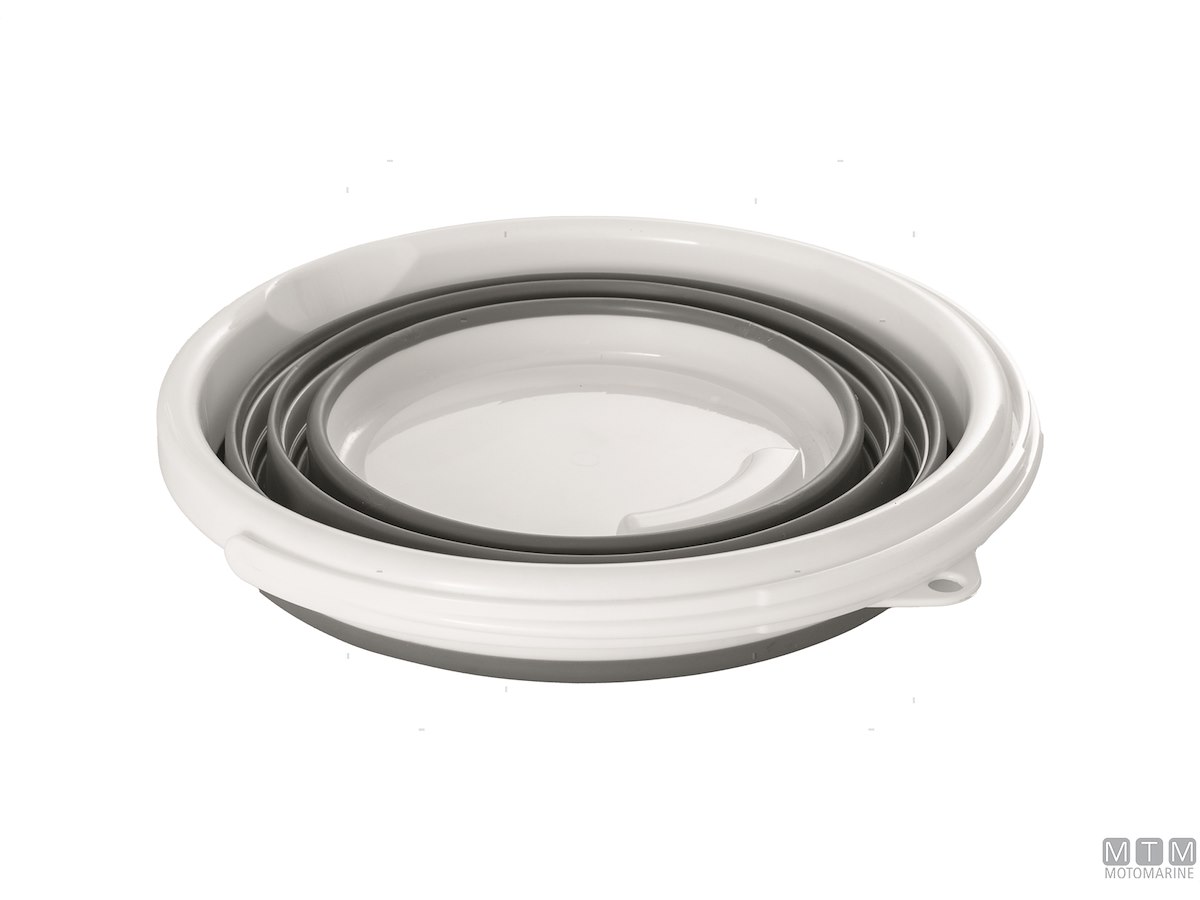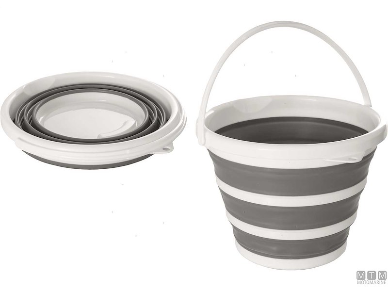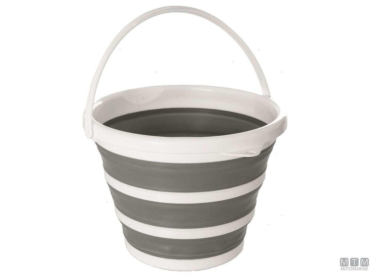 Secchio piegabile a disco per un ingombro minimo, può essere appeso a paratia su gancio. Grazie alle fasce combinate in plastica e gomma si estende e piega in un'attimo.Dimensioni da chiuso dia 33 x H5 cm.