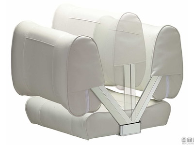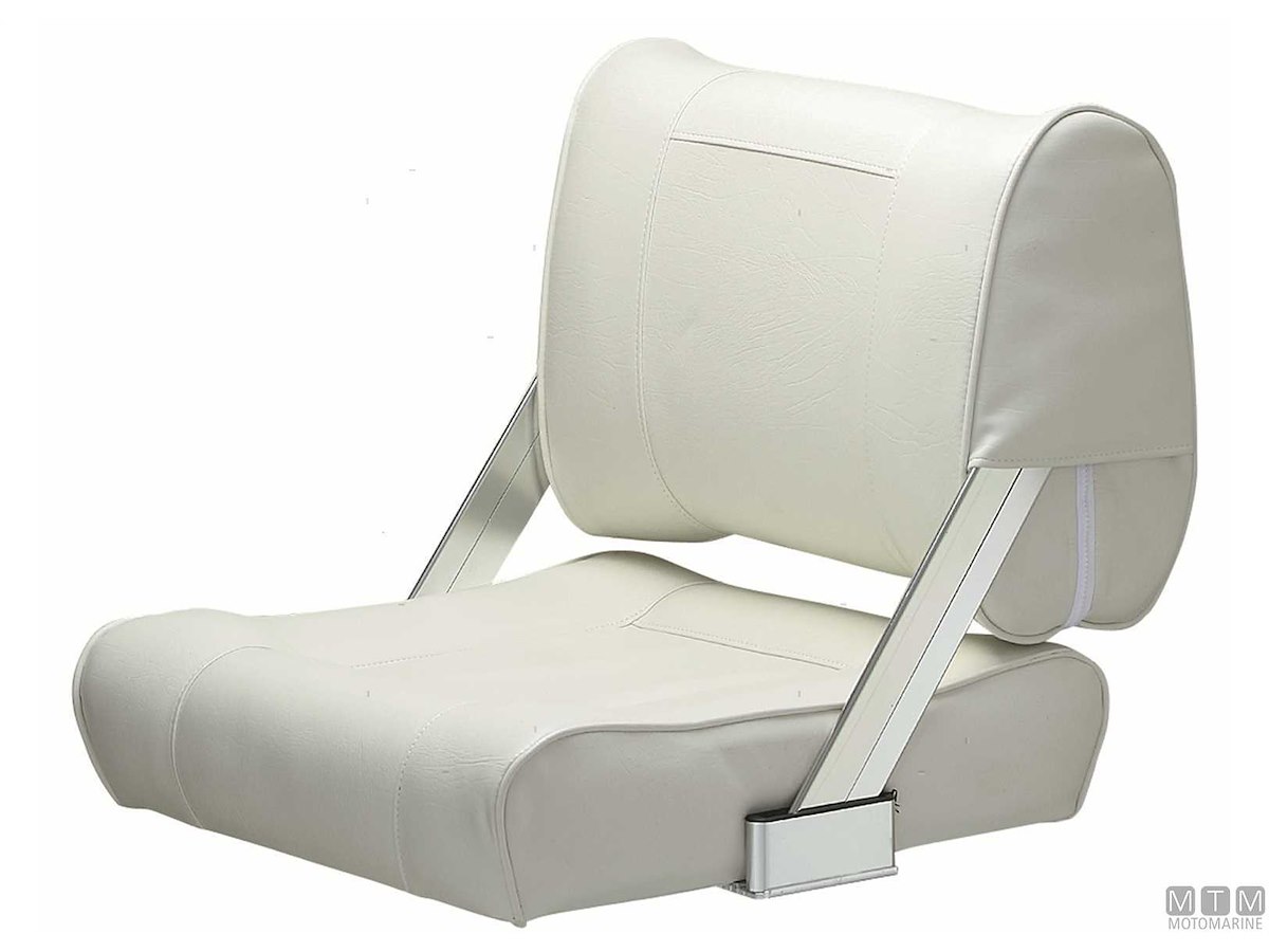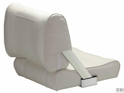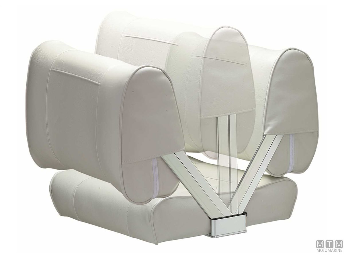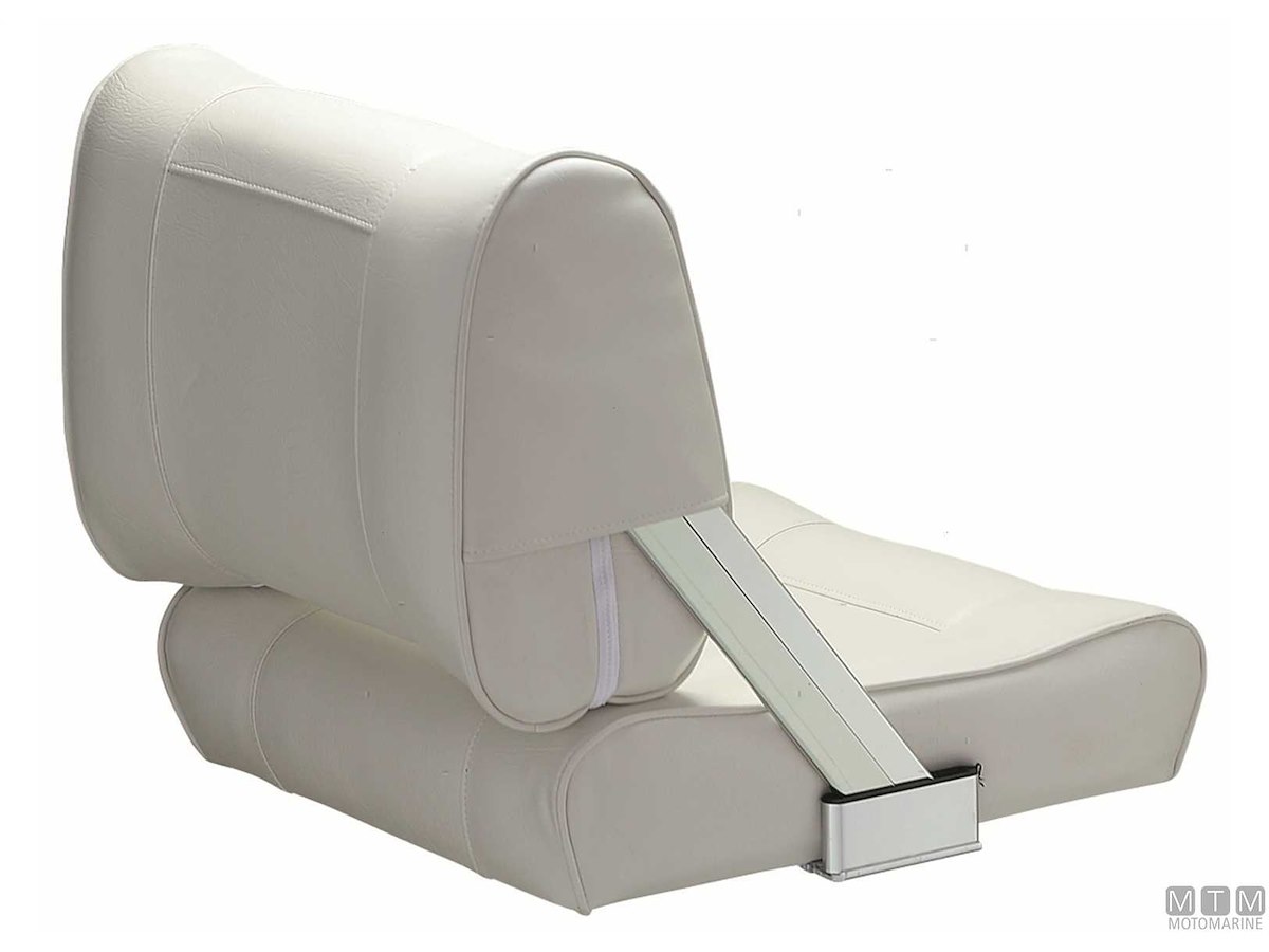 Sedile imbottito, rivestito in Skay marino. Lo schienale può essere posizionato fronte o retro, permettendo così una doppia posizione di guida e di lavoro.
