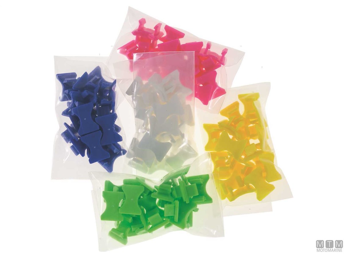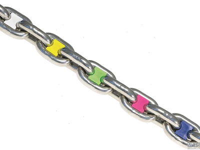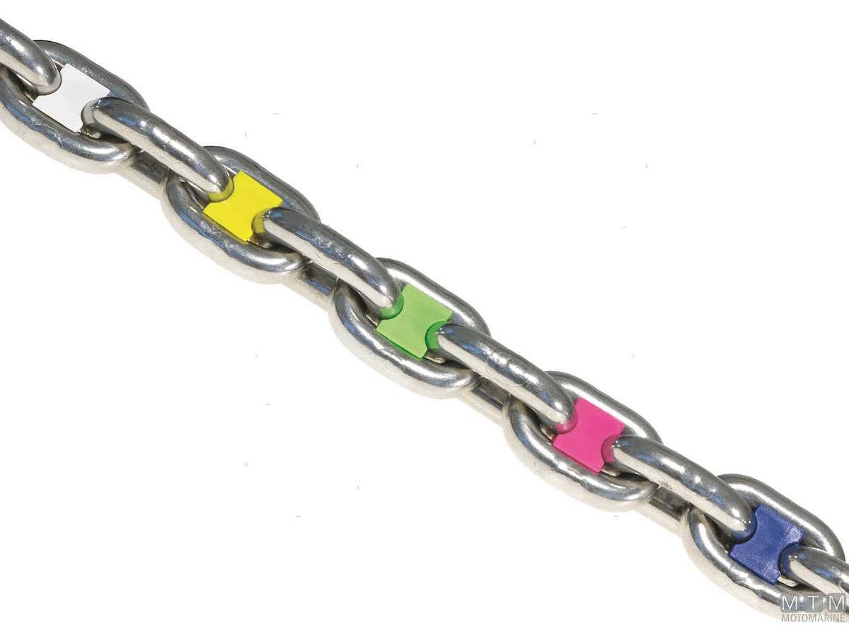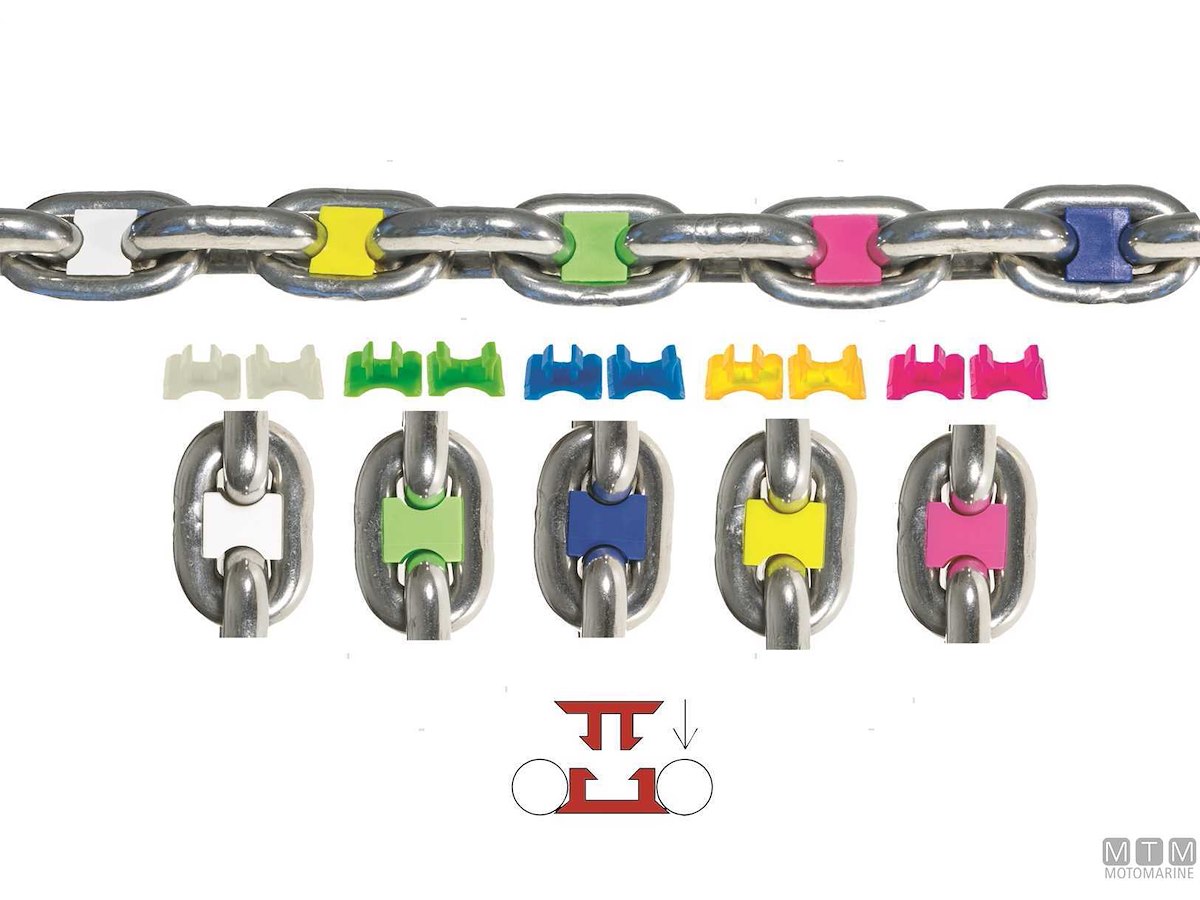 Segna catena in polimero antiurto appositamente progettato per uso marino. Si usano per marcare le varie lunghezze della catena. Montaggio semplice con sistema a incastro: una volta inseriti nella maglia non cadono più. Confezione da 50 pezzi, 10 pezzi per ognuno dei 5 colori.