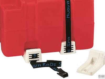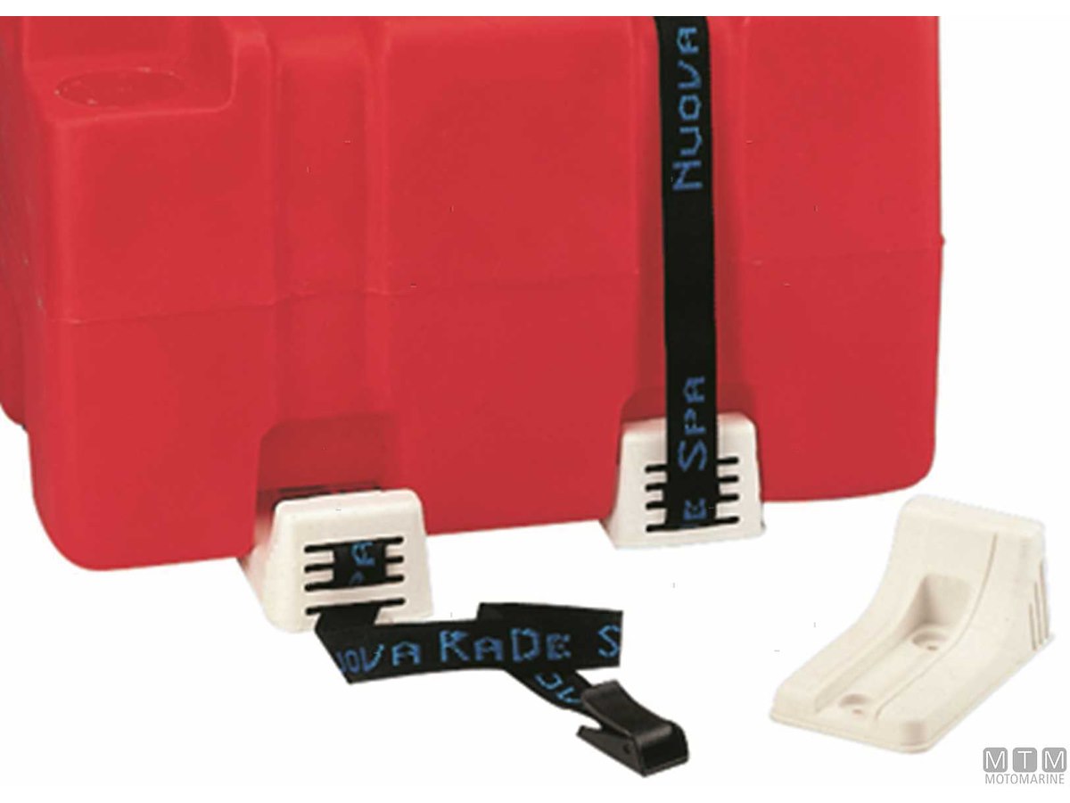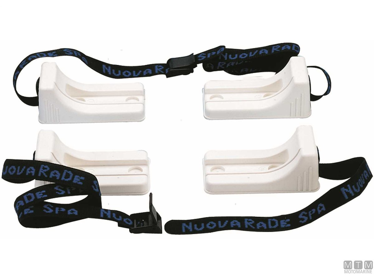 Sella in plastica rinforzata per zattere autogonfiabili completa di cinghie e fibbie a sgancio rapido lunghezza 2x2,5 metri. 4 Basi 65x110 mm con interasse fori 28 mm.