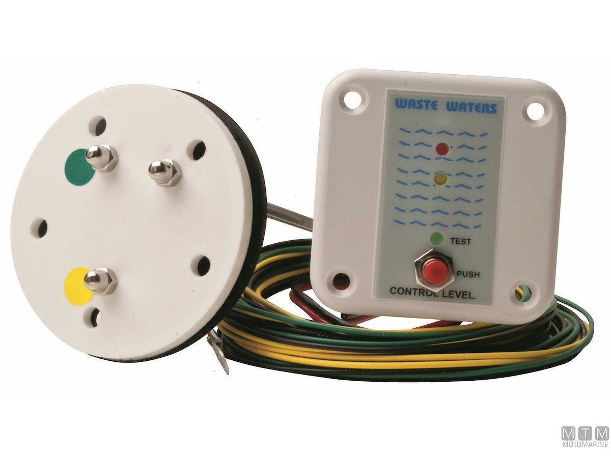 Pannello indicatore livello acque nere 12/24V. Sonda H13 cm con flangia universale tipo VDO a 5 fori.