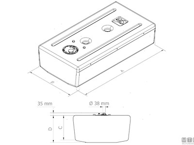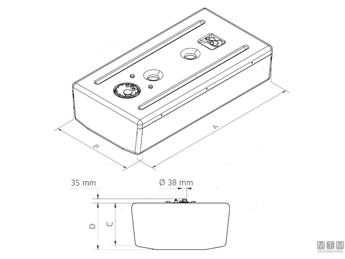 Serbatoio leggermente sagomato a fondo barca in Polietilene reticolato con raccordi prestampati per primi impianti OEM. Completo di boccaporto con sfiato da 17/19 mm, uscita con pescante da 12 mm e tappo filettato. Certificazione RINa CE-ISO21487.