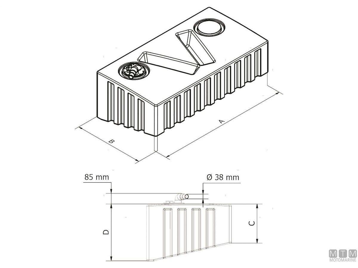 Serbatoio sagomato a posizione laterale fondo barca in Polietilene reticolato completo di boccaporto con sfiato da 17/19 mm, uscita con pescante da 12 mm e bocchettone di carico da 38/50/60 mm. Certificazione CE-ISO21487.
