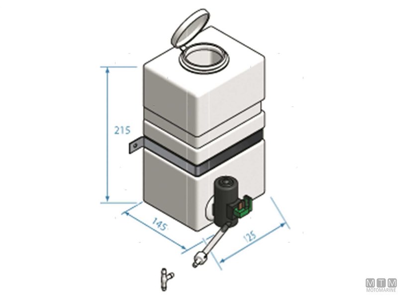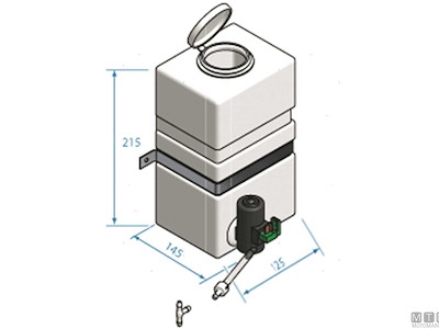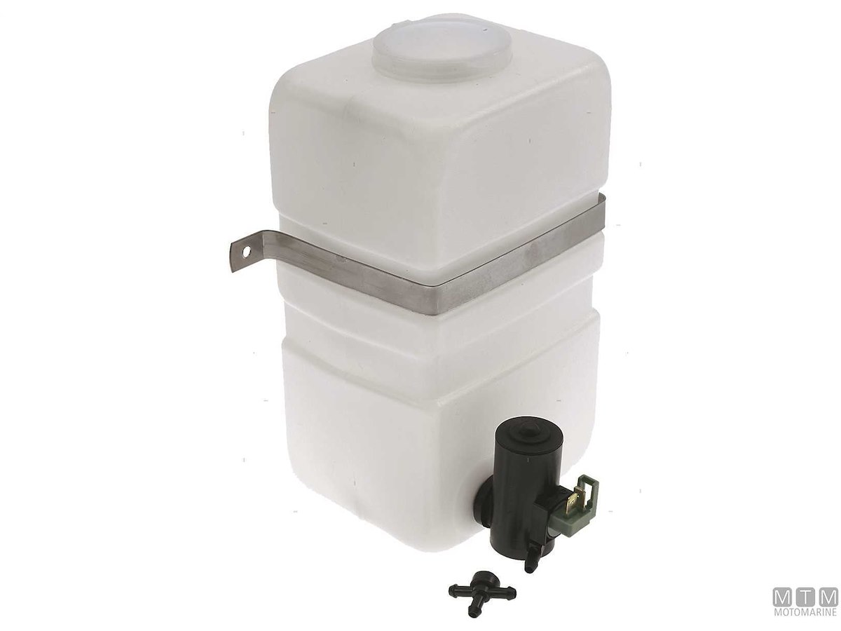 Serbatoio lavavetri Roca con pompa elettrica e raccordo a T. Fascia di fissaggio in Acciaio Inox. Dimensioni 125 x 145 x H215 mm.