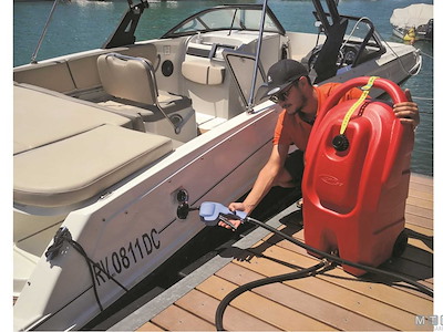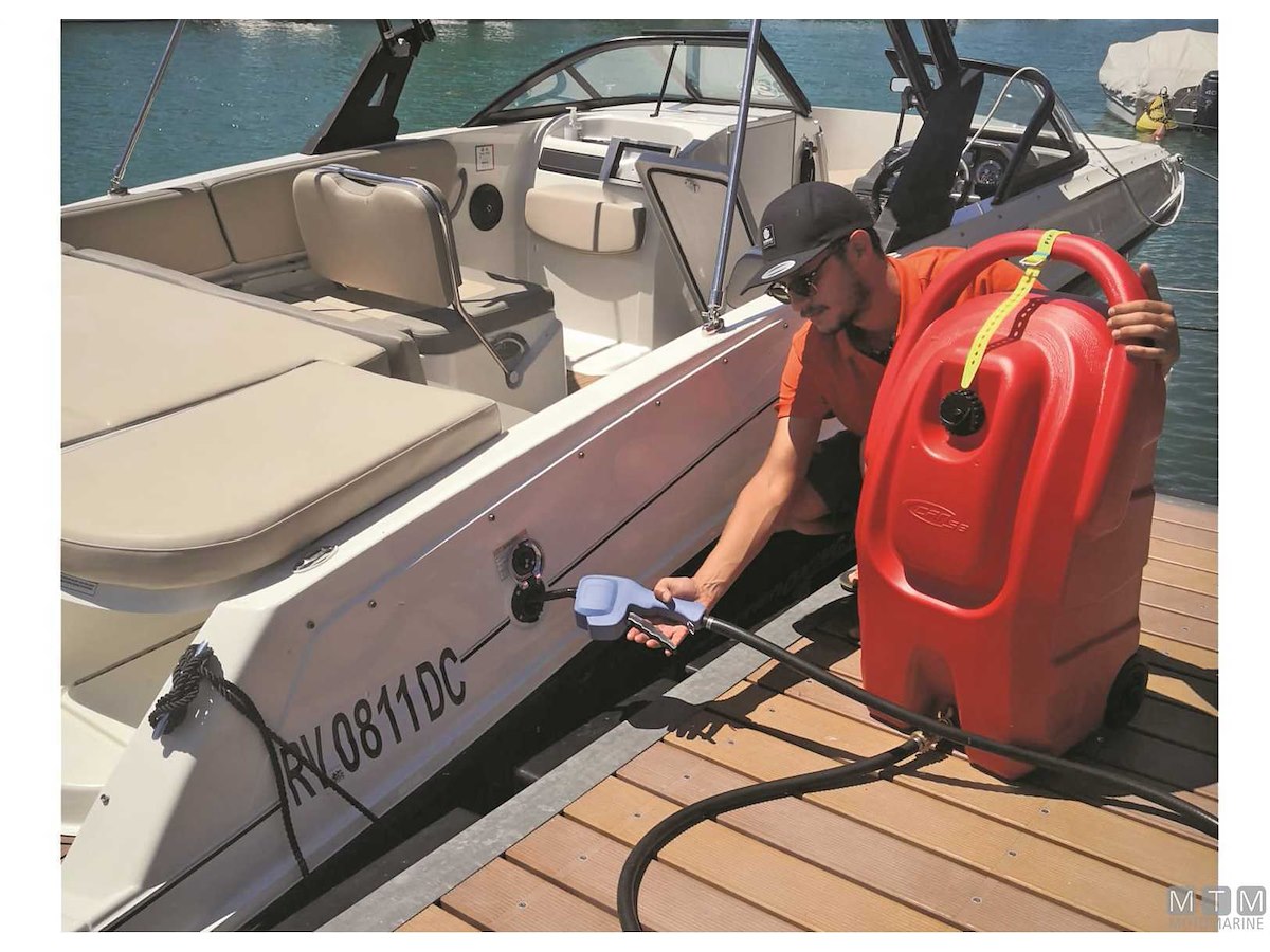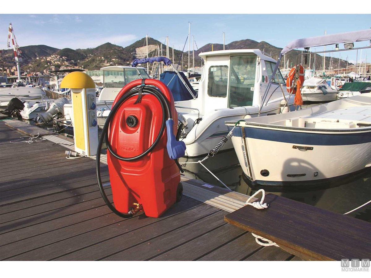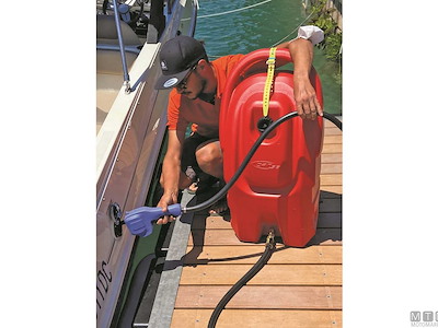 Serbatoio carburante di servizio su ruote. Completo di sfiato, valvola di blocco e tubo flessibile da 3 metri. La pistola erogatrice con portata di 8 Lt/min, grazie alla pompa manuale a pressione incorporata, consente sia il riempimento a caduta che in prevalenza verso l'alto. Omologato UN per trasporto su strada.