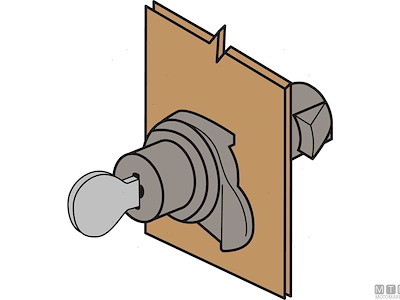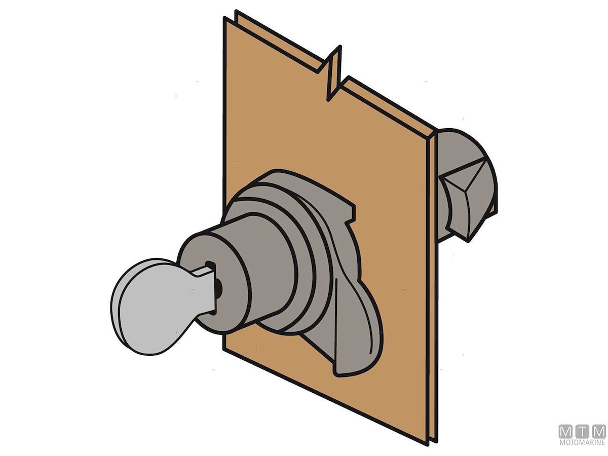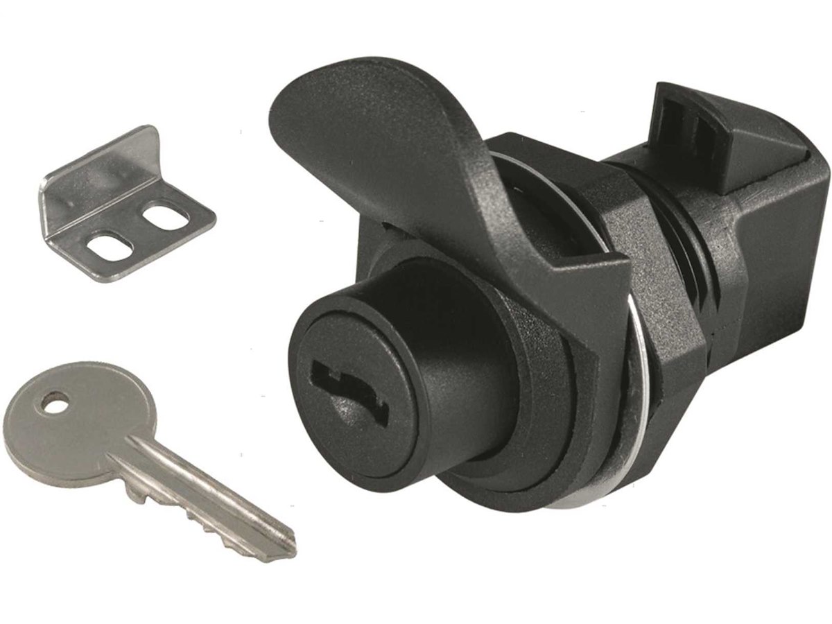 Serratura a pulsante in Nylon caricato con doppia chiave. Completa con rondella di fissaggio e scontro in Acciaio Inox.