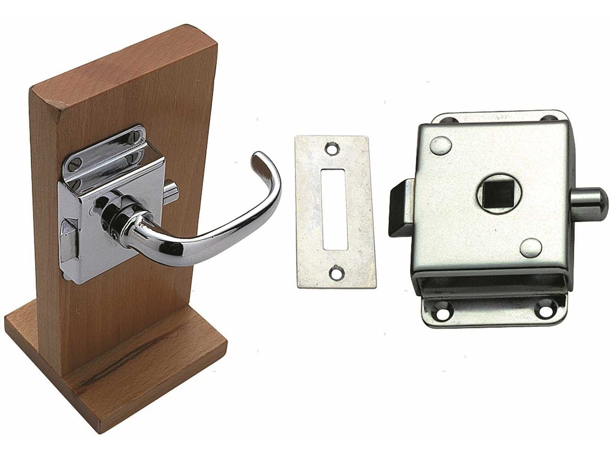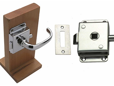 Serratura da accostare con blocco di privacy interno e scontro piano. Corpo in Ottone Cromato. Componenti inossidabili. Mano universale DX/SX.Maniglie da ordinare a parte.